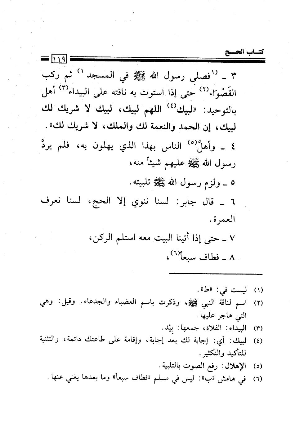 3- (فصلى رسول الله -صلى الله عليه وسلم- فِي اَلْمَسْجِدِ) 1، ثُمَّ رَكِبَ اَلْقَصْوَاءَ2 حَتَّى إِذَا اِسْتَوَتْ بِهِ نَاقَتُهُ عَلَى اَلْبَيْدَاءِ3 أهَلَّ بِالتَّوْحِيدِ: "لَبَّيْكَ4 اَللَّهُمَّ لَبَّيْكَ، لَبَّيْكَ لَا شَرِيكَ لَكَ لَبَّيْكَ، إِنَّ اَلْحَمْدَ وَالنِّعْمَةَ لَكَ وَالْمُلْكَ، لَا شَرِيكَ لَكَ".