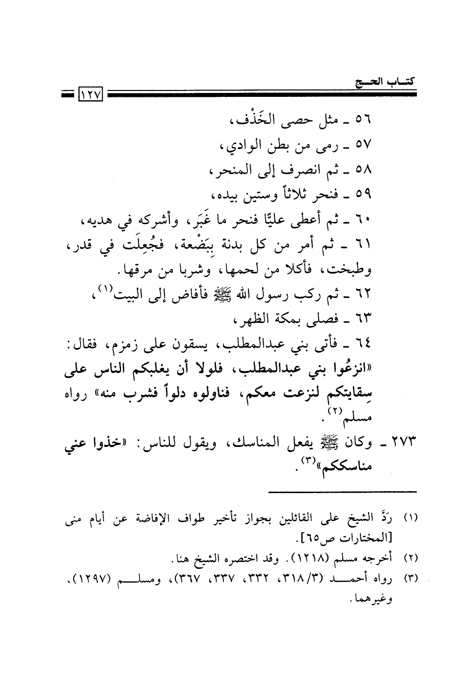 273- وَكَانَ صلى الله عليه وسلم يَفْعَلُ اَلْمَنَاسِكَ، وَيَقُولُ لِلنَّاسِ: "خُذُوا عني مناسككم" 3.