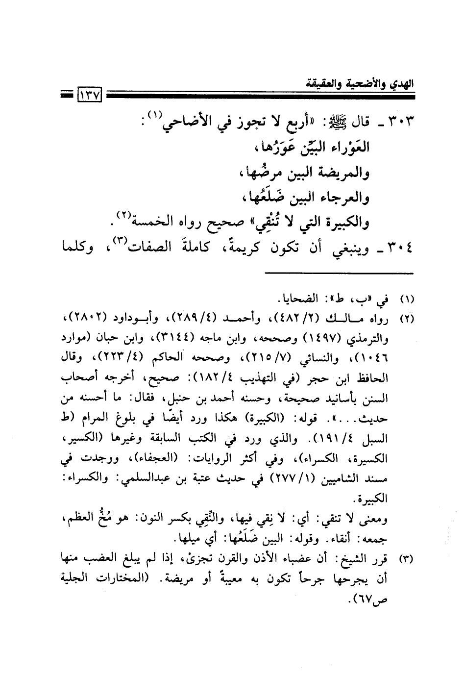 303- قال صلى الله عليه وسلم: "أربع لا تجوز في الأضاحي1:اَلْعَوْرَاءُ الْبَيِّنُ عَوَرُهَا، وَالْمَرِيضَةُ اَلْبَيِّنُ مَرَضُهَا، وَالْعَرْجَاءُ البين ضلعها، وَالْكَبِيرَة اَلَّتِي لَا تُنْقِي" صَحِيحٌ رَوَاهُ اَلْخَمْسَةُ2.