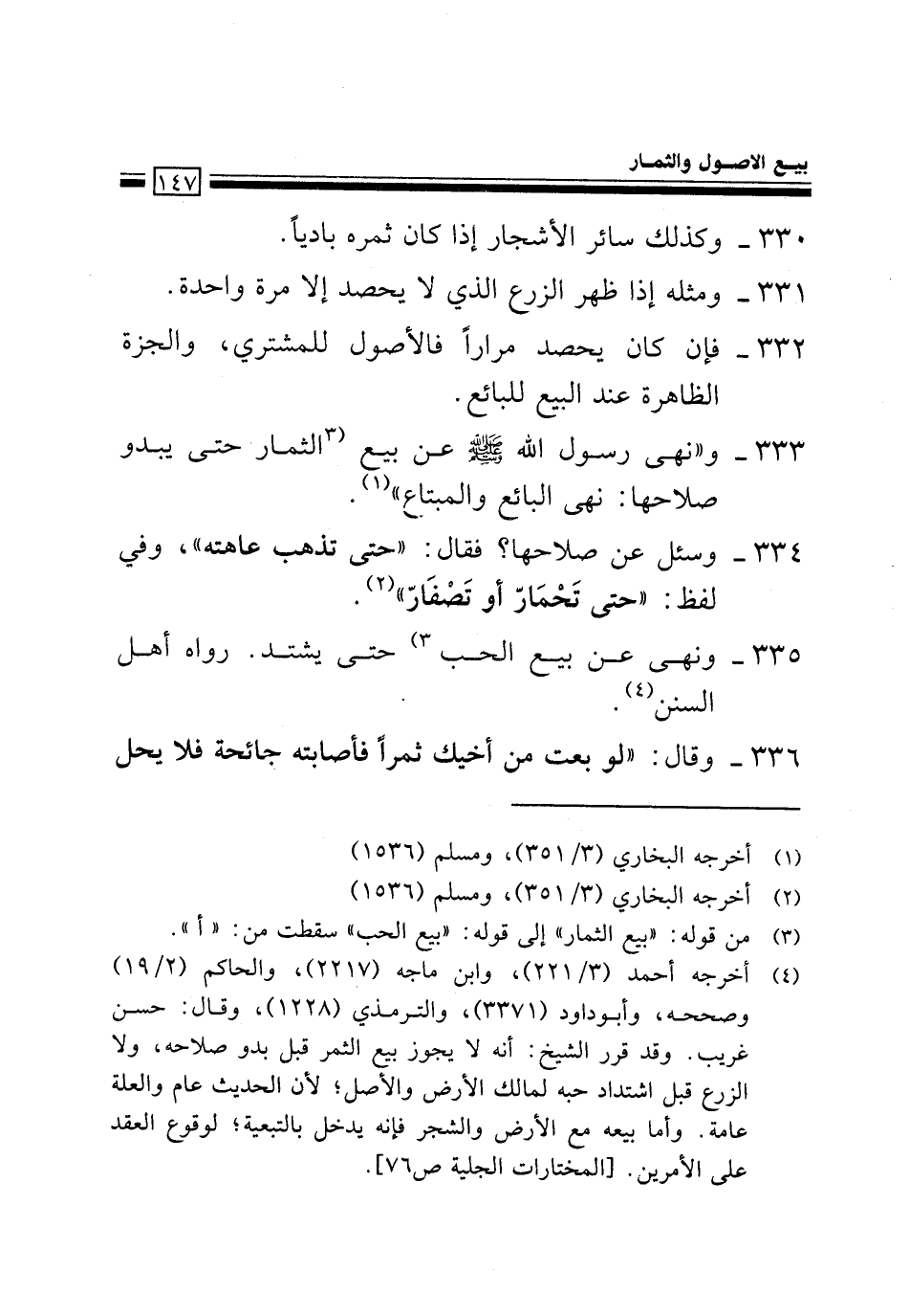 333- ونهى رسول- الله -صلى الله عليه وسلم- عن بَيْعِ (اَلثِّمَارِ حَتَّى يَبْدُوَ صَلَاحُهَا: نَهَى اَلْبَائِعَ وَالْمُبْتَاعَ1.