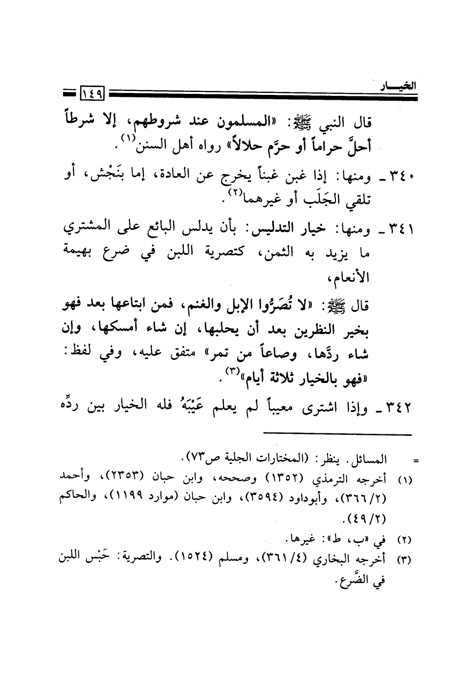 قَالَ صلى الله عليه وسلم: "لَا تُصَرُّوا اَلْإِبِلَ وَالْغَنَمَ، فَمَنْ اِبْتَاعَهَا بَعْدُ فَهُوَ بِخَيْرِ اَلنَّظَرَيْنِ بَعْدَ أَنْ يَحْلُبَهَا، إِنْ شَاءَ أَمْسَكَهَا، وَإِنْ شَاءَ رَدَّهَا، وَصَاعًا مِنْ تَمْرٍ" مُتَّفَقٌ عَلَيْهِ، وَفِي لَفْظٍ: "فَهُوَ بِالْخِيَارِ ثَلَاثَةَ أَيَّامٍ" 3.