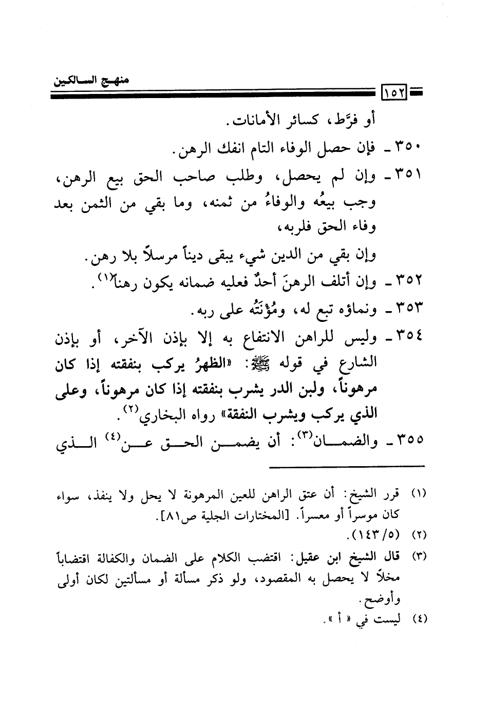 354- وَلَيْسَ لِلرَّاهِنِ اَلِانْتِفَاعُ بِهِ إِلَّا بِإِذْنِ اَلْآخَرِ، أَوْ بِإِذْنِ اَلشَّارِعِ فِي قَوْلِهِ صلى الله عليه وسلم: "اَلظَّهْرُ يُرْكَبُ بِنَفَقَتِهِ إِذَا كَانَ مَرْهُونًا، وَلَبَنُ اَلدَّرِّ يُشْرَبُ بِنَفَقَتِهِ إِذَا كَانَ مَرْهُونًا، وَعَلَى اَلَّذِي يَرْكَبُ وَيَشْرَبُ اَلنَّفَقَةُ" رَوَاهُ اَلْبُخَارِيُّ2.