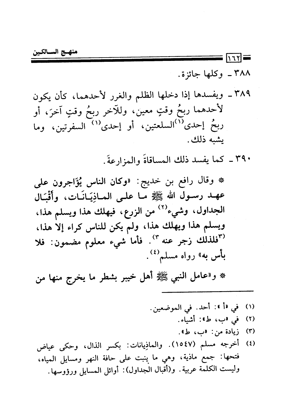 389- وَيُفْسِدُهَا إِذَا دَخَلَهَا اَلظُّلْمُ وَالْغَرَرُ لِأَحَدِهِمَا، كَأَنْ يَكُونَ لِأَحَدِهِمَا رِبْحُ وَقْتٍ مُعَيَّنٍ، وَلِلْآخَرِ رِبْحُ وَقْتٍ آخَرَ، أَوْ رِبْحُ إِحْدَى1 اَلسِّلْعَتَيْنِ، أَوْ إِحْدَى1 اَلسَّفْرَتَيْنِ، وَمَا يُشْبِهُ ذَلِكَ.