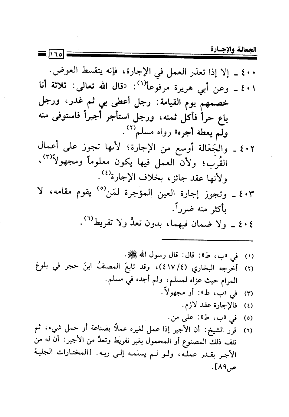 401- وَعَنْ أَبِي هُرَيْرَةِ مَرْفُوعًا1: "قَالَ اَللَّهُ تَعَالَى: ثَلَاثَةٌ أَنَا خَصْمُهُمْ يَوْمَ اَلْقِيَامَةِ: رَجُلٌ أَعْطَى بِي ثُمَّ غَدَرَ، وَرَجُلٌ بَاعَ حُرًّا فَأَكَلَ ثَمَنَهُ، وَرَجُلٌ اِسْتَأْجَرَ أَجِيرًا فَاسْتَوْفَى مِنْهُ وَلَمْ يُعْطِهِ أَجْرَهُ" رَوَاهُ مُسْلِمٌ2.