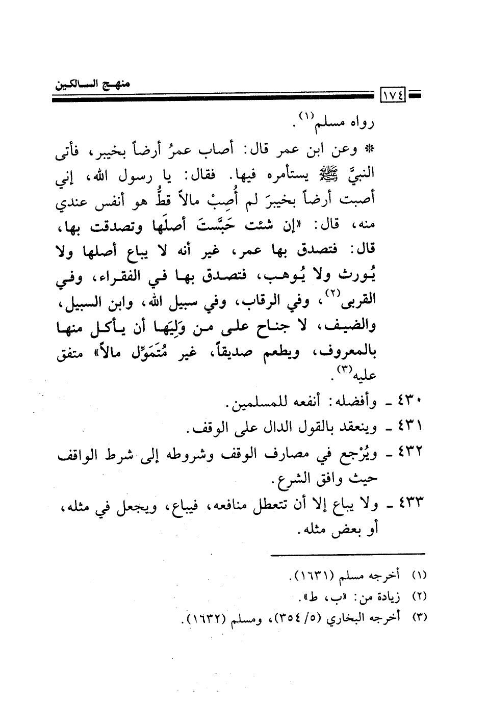 وَعَنْ اِبْنِ عُمَرَ قَالَ: أَصَابَ عمرُ أَرْضًا بِخَيْبَرَ، فَأَتَى اَلنَّبِيَّ -صلى الله عليه وسلم- يَسْتَأْمِرُهُ فِيهَا. فَقَالَ: يَا رَسُولَ اَللَّهِ، إِنِّي أَصَبْتُ أَرْضًا بخيبرَ لَمْ أُصِبْ مَالاً قَطُّ هُوَ أَنْفَسُ عِنْدِي مِنْهُ، قَالَ: "إِنْ شِئْتَ حَبَّسْتَ أَصْلَهَا وَتَصَدَّقْتَ بِهَا"، قَالَ: فَتَصْدَّقَّ بِهَا عُمَرُ، غَيْرَ أَنَّهُ لَا يُبَاعُ أَصْلُهَا وَلَا يُورَثُ وَلَا يُوهَبُ، فَتَصْدَّقَ بِهَا فِي اَلْفُقَرَاءِ، وَفِي اَلْقُرْبَى2، وَفِي اَلرِّقَابِ، وَفِي سَبِيلِ اَللَّهِ، وَابْنِ اَلسَّبِيلِ، وَالضَّيْفِ، لَا جُنَاحَ عَلَى مَنْ وَلِيَهَا أَنْ يَأْكُلَ مِنْهَا بِالْمَعْرُوفِ، وَيُطْعِمَ صَدِيقًا، غَيْرَ مُتَمَوِّلٍ مَالّاً. مُتَّفَقٌ عَلَيْهِ3.