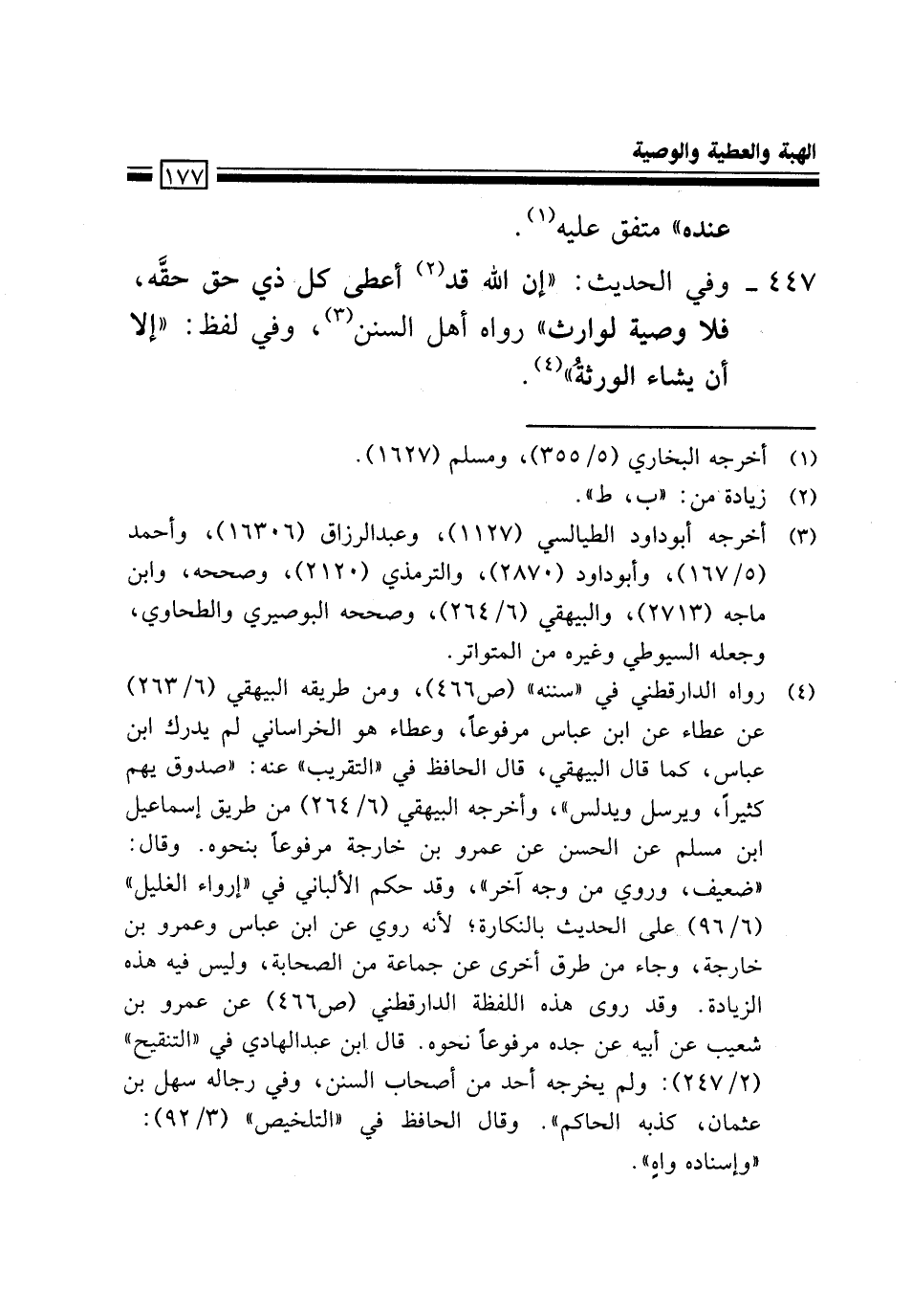 447- وَفِي اَلْحَدِيثِ: "إِنَّ اَللَّهَ قَدْ2 أَعْطَى كُلَّ ذِي حَقٍّ حَقَّهُ، فَلَا وَصِيَّةَ لِوَارِثٍ" رَوَاهُ أَهْلُ اَلسُّنَنِ3، وَفِي لَفْظِ: "إِلَّا أن يشاء الورثة" 4.