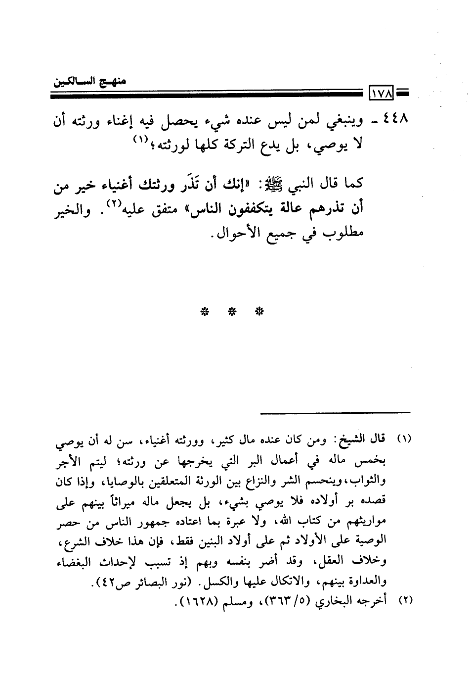 448- وَيَنْبَغِي لِمَنْ لَيْسَ عِنْدَهُ شَيْءٌ يَحْصُلُ فِيهِ إِغْنَاءُ وَرَثَتِهِ أَنْ لَا يُوصِيَ، بَلْ يَدَعَ التَّرِكَةَ كلَّها لورثته1؛ كما قال النبي صلى الله عليه وسلم: "إنك إن تذر ورثتك أغنياء خير من أن تذرهم عالة يتكففون الناس" مُتَّفَقٌ عَلَيْهِ2. وَالْخَيْرُ مَطْلُوبٌ فِي جَمِيعِ اَلْأَحْوَالِ.