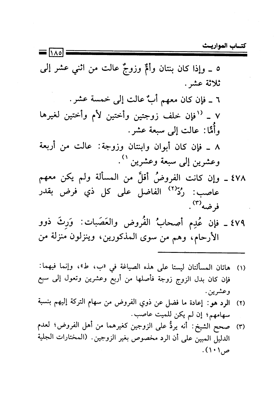 478- وَإِنْ كَانَتْ اَلْفُرُوضُ أَقَلَّ مِنْ اَلْمَسْأَلَةِ وَلَمْ يَكُنْ معهم عاصب، رُدَّ2 الفاضل على ذي فرض بقدر فرضه3.