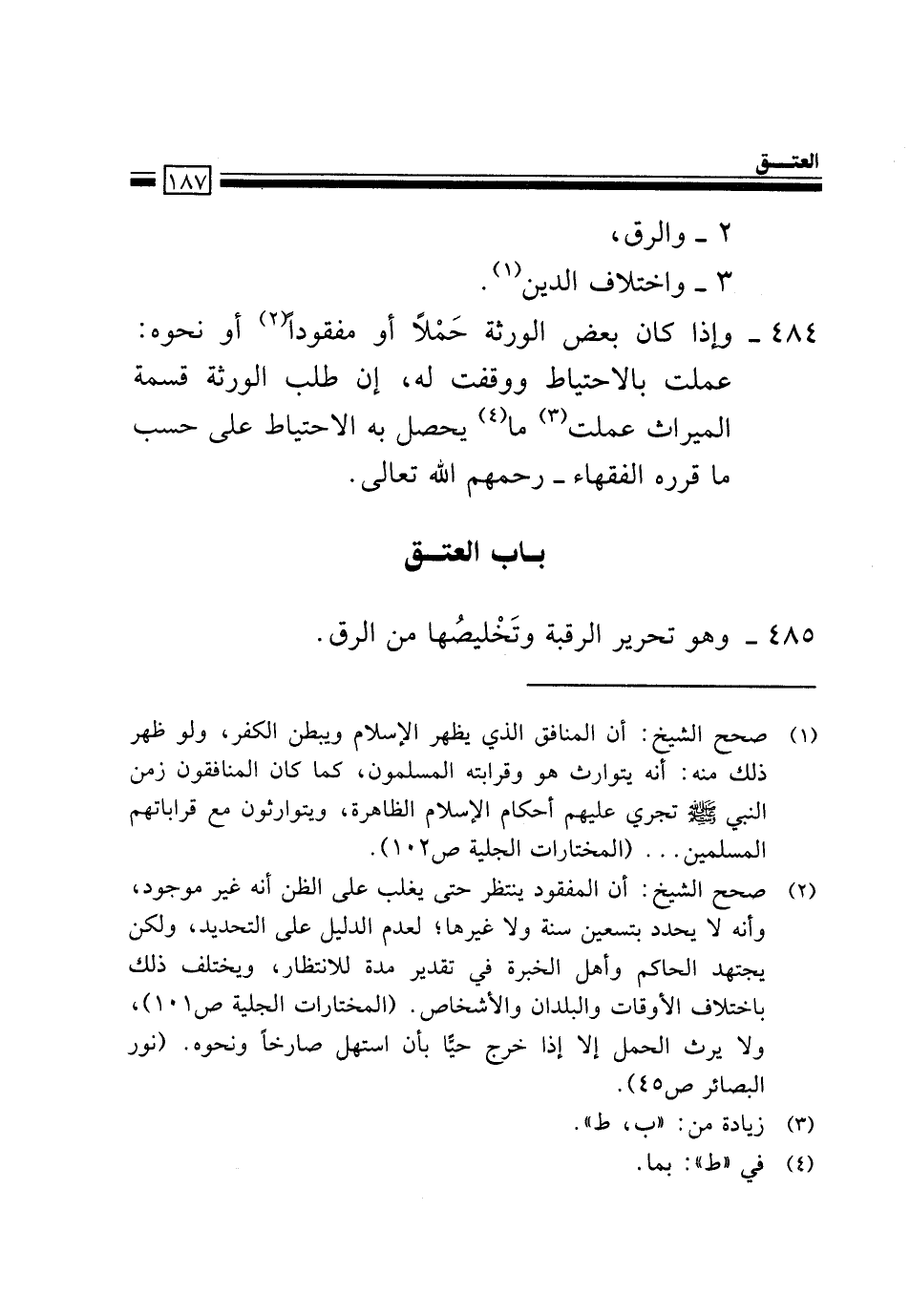 484- وَإِذَا كَانَ بَعْضُ اَلْوَرَثَةِ حَمْلاً أَوْ مَفْقُودًا2 أَوْ نَحْوَهُ: عَمِلْتَ بِالِاحْتِيَاطِ وَوَقَفْتَ لَهُ، إِنْ طَلَبَ اَلْوَرَثَةُ قِسْمَةَ اَلْمِيرَاثِ عَمِلْتَ3 مَا4 يَحْصُلُ بِهِ اَلِاحْتِيَاطُ عَلَى حَسَبِ مَا قَرَّرَهُ اَلْفُقَهَاءُ، رحمهم الله تعالى.