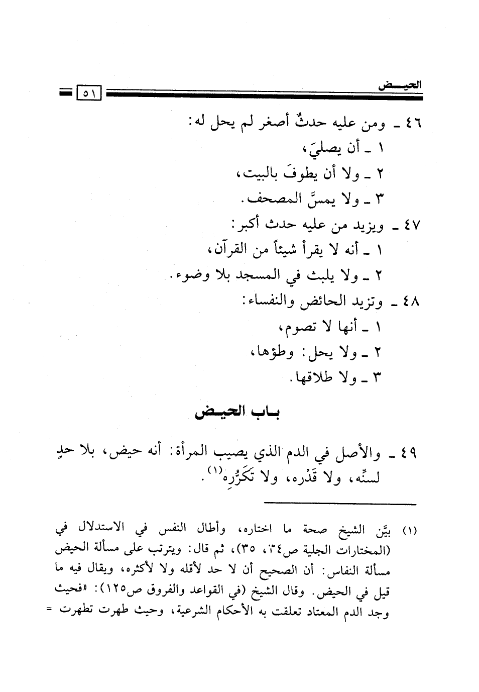 49- وَالْأَصْلُ فِي اَلدَّمِ اَلَّذِي يُصِيبُ اَلْمَرْأَةَ: أَنَّهُ حَيْضٌ، بِلَا حدٍ لسنِّه، وَلَا قدره، ولا تكرره 1.