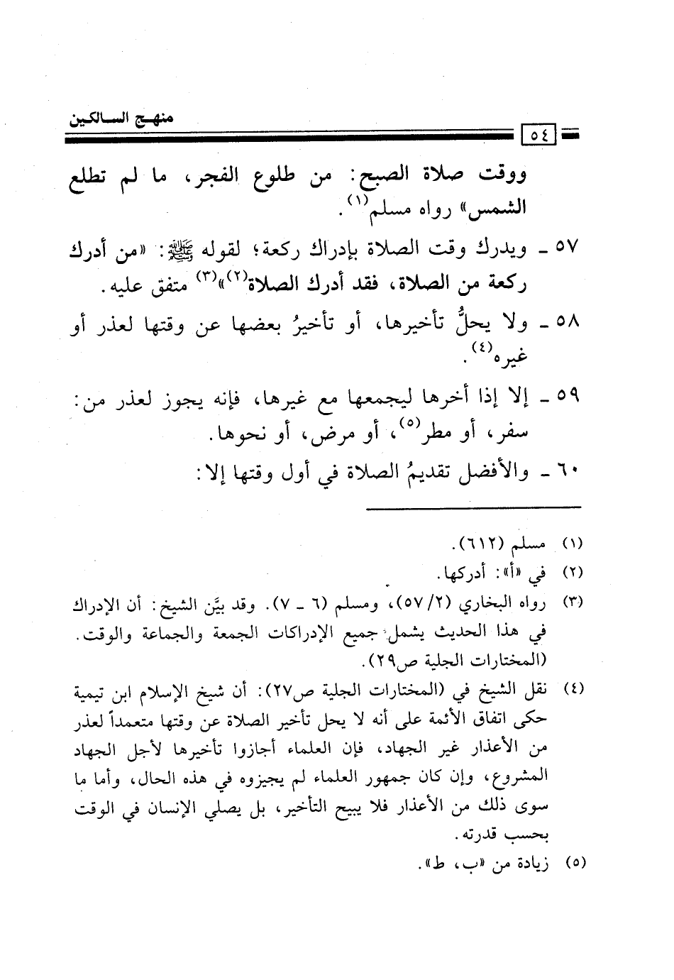 58- وَلَا يُحِلُّ تَأْخِيرُهَا، أَوْ تَأْخِيرُ بَعْضِهَا عَنْ وَقْتِهَا لِعُذْرٍ أَوْ غَيْرِهِ 4.