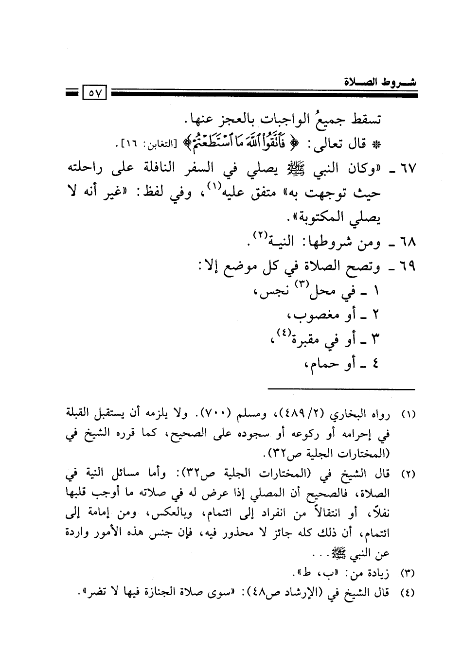 1 رواه البخاري "489/2"، ومسلم "700". ولا يلزمه أن يستقبل القبلة في إحرامه أو ركوعه أو سجوده على الصحيح، كما قرره الشيخ في "المختارات الجلية، ص: 32".