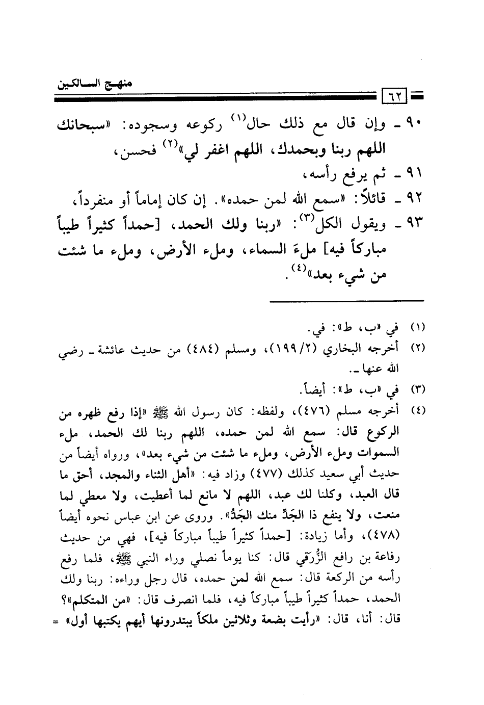 93- وَيَقُولُ اَلْكُلُّ3: رَبَّنَا وَلَكَ اَلْحَمْدُ، [حَمْدًا كَثِيرًا طَيِّبًا مُبَارَكًا فِيهِ] مِلْءَ اَلسَّمَاءِ، وَمِلْءَ اَلْأَرْضِ، وملء ما شئت من شيء بعد4.