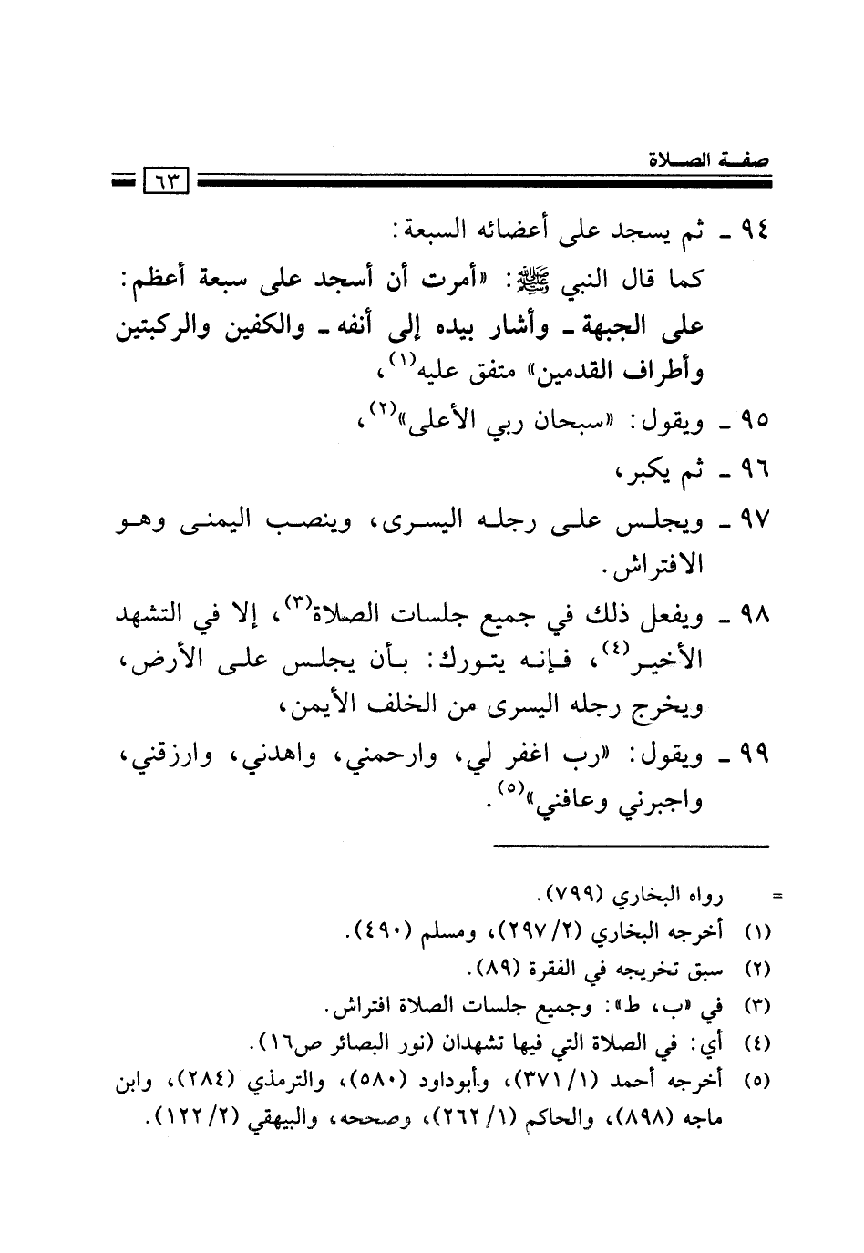 94- ثُمَّ يَسْجُدُ عَلَى أَعْضَائِهِ اَلسَّبْعَةِ، كَمَا قَالَ اَلنَّبِيُّ صلى الله عليه وسلم: "أُمِرْتُ أَنْ أَسْجُدَ عَلَى سَبْعَةِ أَعْظُم: عَلَى الْجَبْهَةِ -وَأَشَارَ بِيَدِهِ إِلى أَنْفِهِ- وَالكَفَّينِ والرُّكْبَتَينِ وَأَطْرَافِ القَدَمَينِ" مُتَّفَقٌ عَلَيْهِ1،