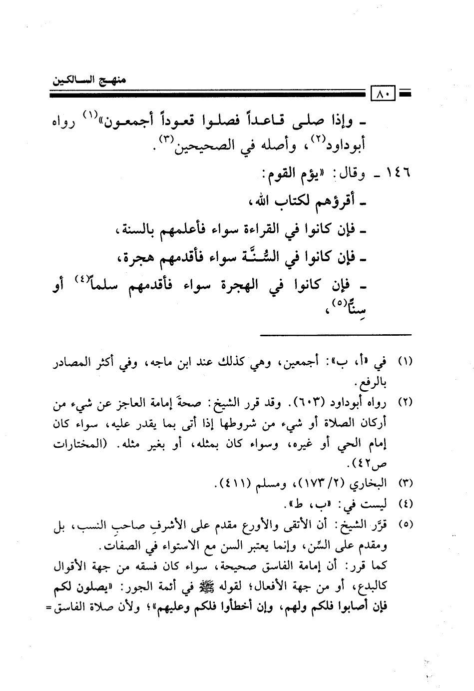 146- وقال: "يَؤُمُّ القَومَ أَقْرَؤُهُمْ لِكِتَابِ اللهِ، فَإِنْ كَانُوا فِي القِرَاءَةِ سَوَاءٌ فَأَعْلَمُهُمْ بِالسُّنَّةِ، فَإِنْ كَانُوا فِي الْهِجْرَةِ سَوَاءٌ فَأَقْدَمُهُمْ سِلْمًا4 أو سنًّا 5،