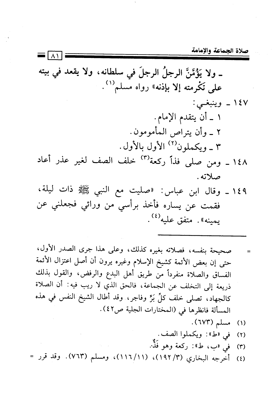 149- وَقَالَ اِبْنُ عَبَّاسٍ: صَلَّيْتُ مَعَ اَلنَّبِيِّ -صلى الله عليه وسلم- ذَاتَ لَيْلَةٍ، فَقُمْتُ عَنْ يَسَارِهِ فَأَخَذَ بِرَأْسِي مِنْ وَرَائِي فَجَعَلَنِي عَنْ يَمِينِهِ. متفق عليه4.
