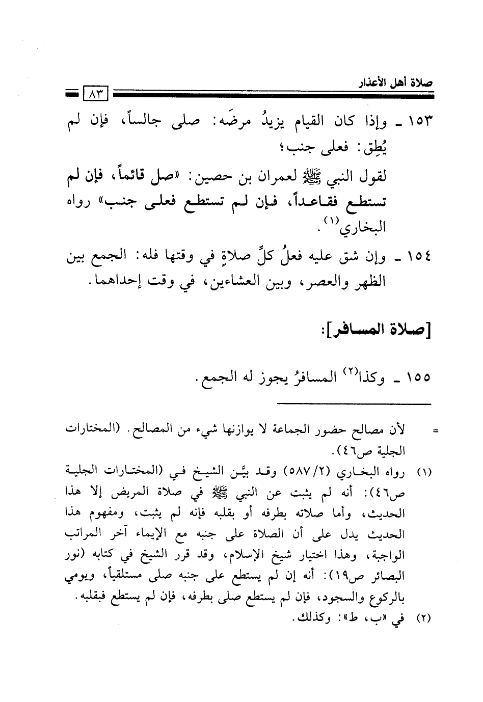 1 رواه البخاري "587/2" وقد بَيَّن الشيخ في "المختارات الجلية، ص: 46 ": أنه لم يثبت عن النبي -صلى الله عليه وسلم- في صلاة المريض إلا هذا الحديث، وأما صلاته بطرفه أو بقلبه فإنه لم يثبت، ومفهوم هذا الحديث يدل على أن الصلاة على جنبه مع الإيماء آخر المراتب الواجبة، وهذا اختيار شيخ الإسلام، وقد قرر الشيخ في كتابه "نور البصائر، ص: 19": أنه إن لم يستطع على جنبه صَلَّى مستلقيًا، ويومي بالركوع والسجود، فإن لم يستطع صلى بطرفه، فإن لم يستطع فبقلبه.