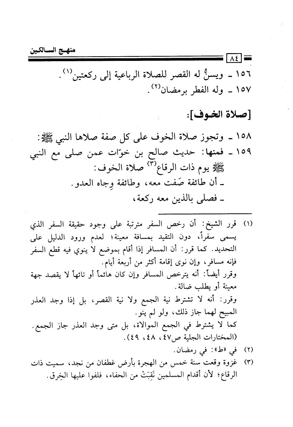 156- ويُسن لَهُ اَلْقَصْرُ لِلصَّلَاةِ اَلرُّبَاعِيَّةِ إِلَى رَكْعَتَيْن 1.