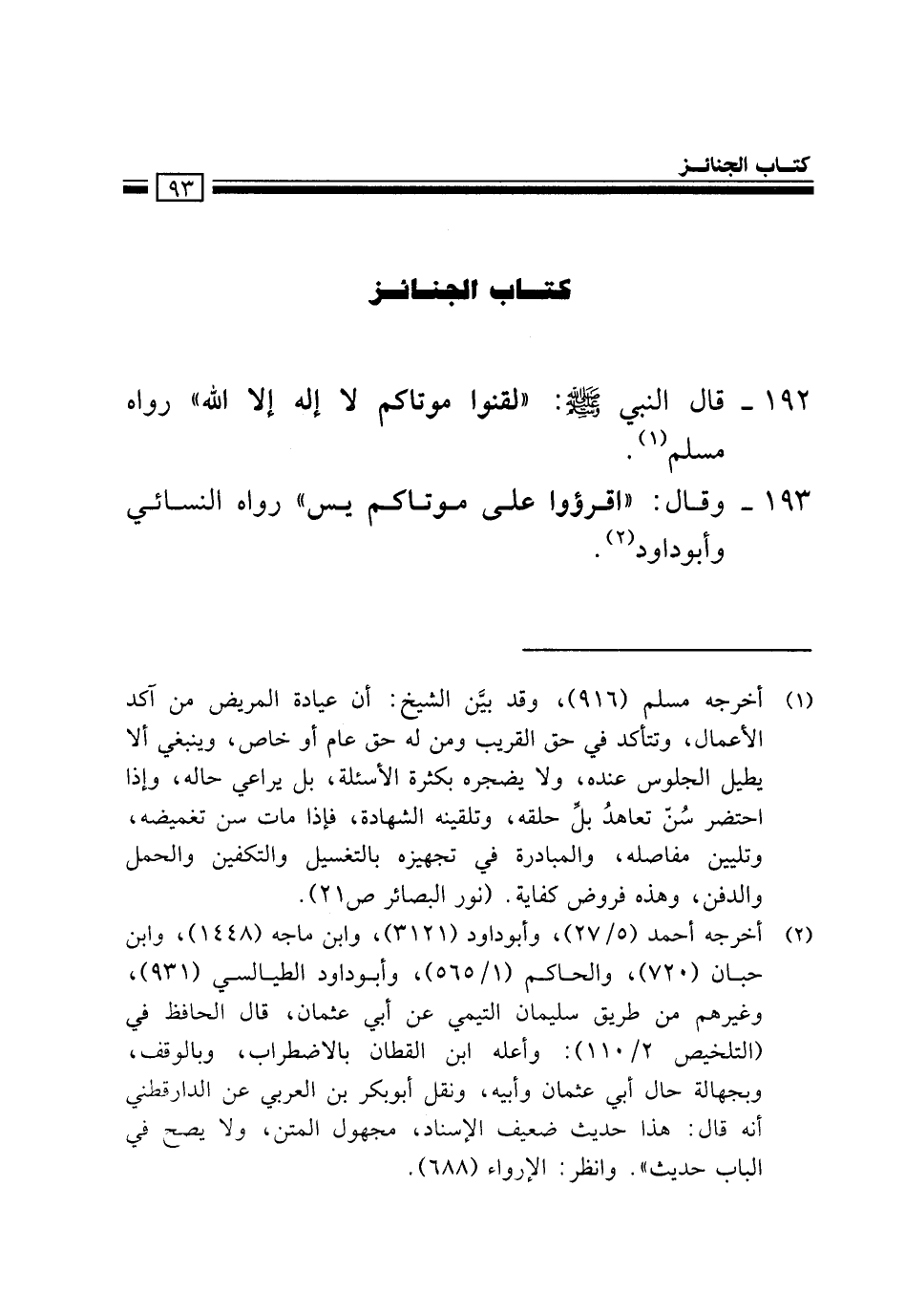192- قَالَ اَلنَّبِيُّ صلى الله عليه وسلم: "لَقِّنُوا مَوْتَاكُمْ لَا إِلَهَ إِلَّا اَللَّهُ" رواه مسلم1.