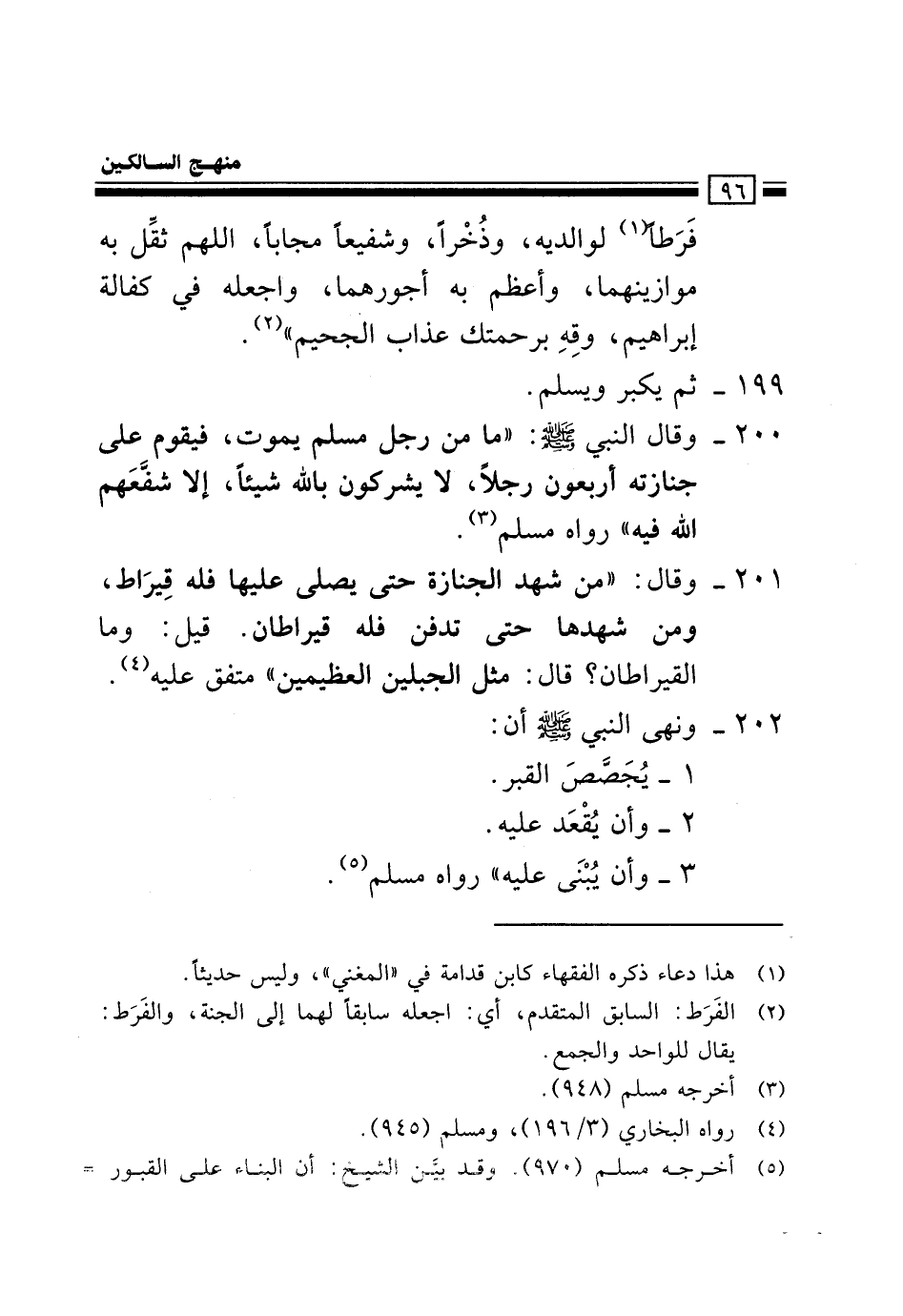 200- وَقَالَ اَلنَّبِيُّ صلى الله عليه وسلم: "مَا مِنْ رَجُلٍ مُسْلِمٍ يَمُوتُ، فَيَقُومُ عَلَى جَنَازَتِهِ أَرْبَعُونَ رَجُلًا، لَا يُشْرِكُونَ بِاَللَّهِ شَيْئًا، إِلَّا شَفَّعَهُمْ اَللَّهُ فِيهِ" رَوَاهُ مُسْلِمٌ3.