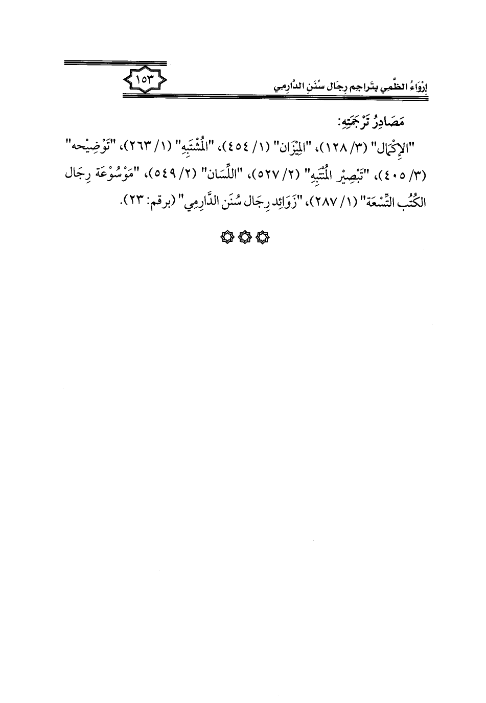 " الإكْمَال" (٣/ ١٢٨)، "المِيْزَان" (١/ ٤٥٤)، "المُشْتَبِهِ" (١/ ٢٦٣)، "تَوْضِيْحه" (٣/ ٤٠٥)، "تَبْصِيْر المُنْتَبِهِ" (٢/ ٥٢٧)، "اللِّسَان" (٢/ ٥٤٩)، "مَوْسُوْعَة رِجَال الكُتُب التِّسْعَة" (١/ ٢٨٧)، "زَوَائِد رِجَال سُنَن الدَّارِمي" (برقم: ٢٣).