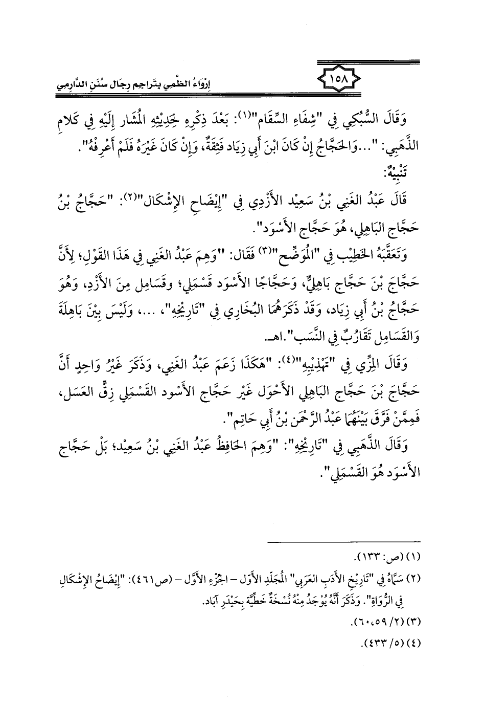 وَتَعَقَّبَهُ الخَطِيْب فِي "المُوَضِّح" (¬٣) فَقَال: "وَهِمَ عَبْدُ الغَنِي فِي هَذَا القَوْلِ؛ لِأَنَّ حَجَّاجَ بْنَ حَجَّاج بَاهِلِيٌّ، وَحَجَّاجًا الأَسْوَد قَسْمَلِي؛ وقَسَامِل مِنَ الأَزْدِ، وَهُوَ حَجَّاجُ بْنُ أَبِي زِيَاد، وَقَدْ ذَكَرَهُمَا البُخَارِي فِي "تَارِيْخِهِ"، ... ، وَلَيْسَ بِيْنَ بَاهِلَةَ وَالقَسَامِل تَقَارُبٌ فِي النَّسَب". اهـ.