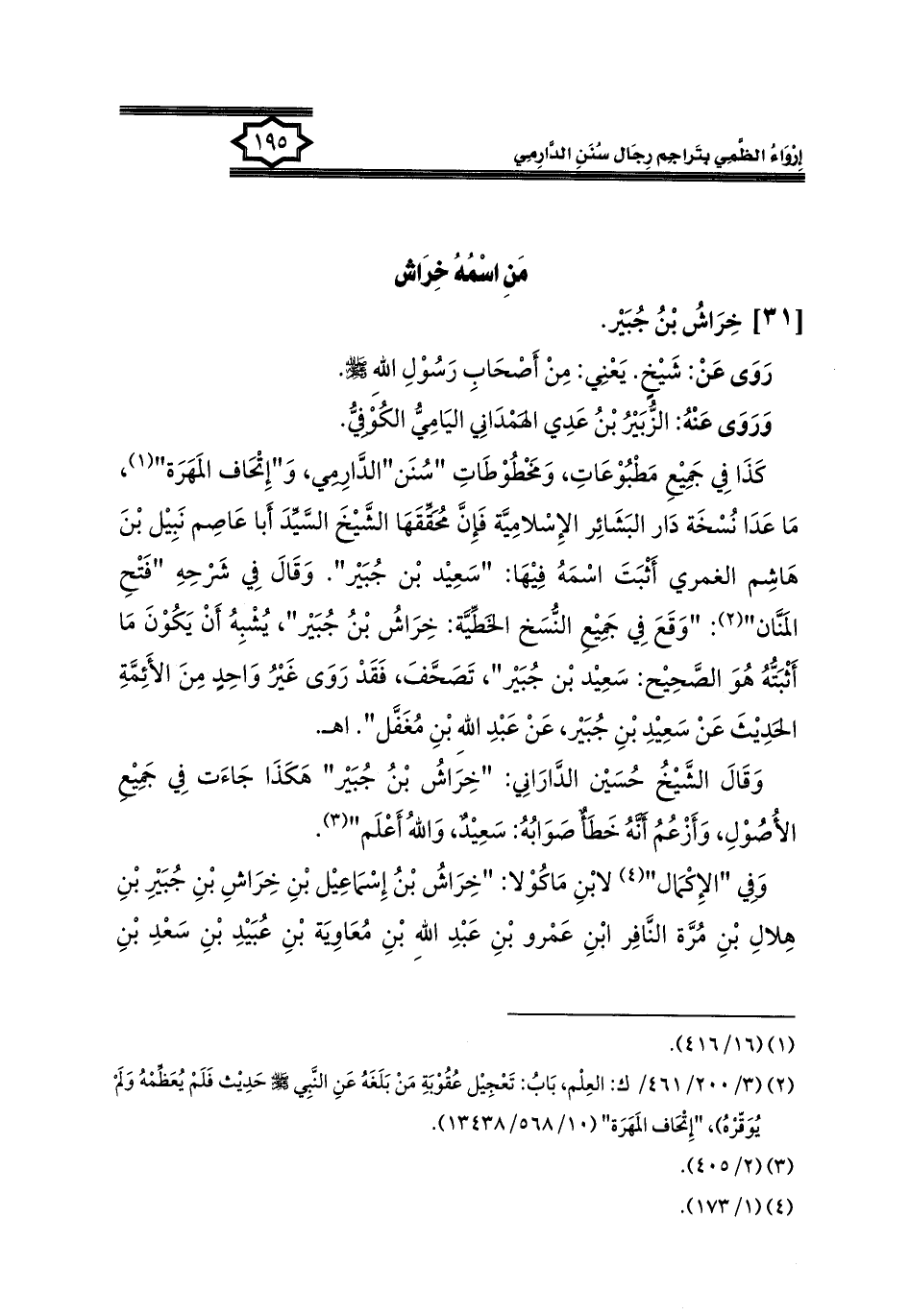 وَقَالَ الشَّيْخُ حُسَيْن الدَّارَانِي: "خِرَاشُ بْنُ جُبَيْر" هَكَذَا جَاءَت فِي جَمِيْعِ الأُصُوْلِ، وَأَزْعُمُ أَنَّهُ خَطَأٌ صَوَابُهُ: سَعِيْدٌ، وَاللهُ أَعْلَم" (¬٣).