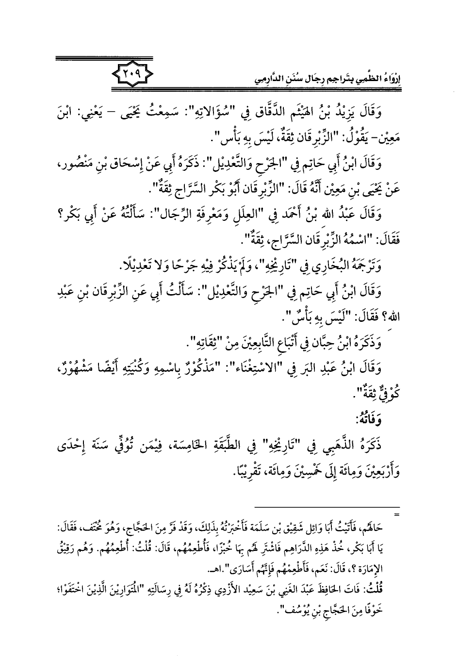 وَقَالَ ابْنُ أَبِي حَاتِم فِي "الجَرْحِ وَالتَّعْدِيْل": ذَكَرَهُ أَبِي عَنْ إِسْحَاق بْنِ مَنْصُور، عَنْ يَحْيَى بْنِ مَعِيْن أَنَّهُ قَالَ: "الزِّبْرِقَان أَبُوْ بَكْر السَّرَّاج ثِقَةٌ".