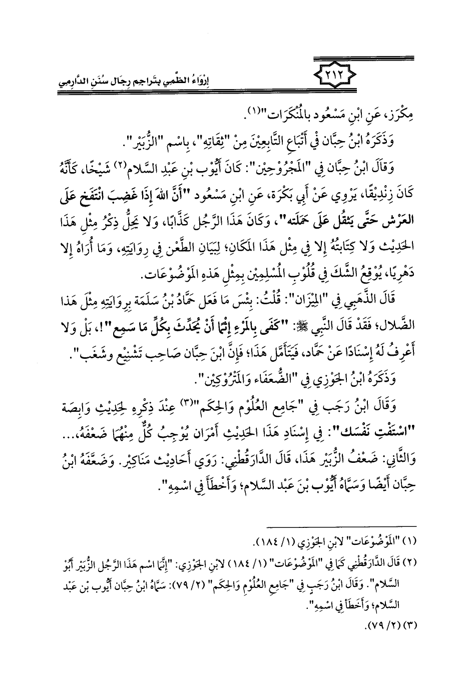 (¬٢) قَالَ الدَّارَقُطْنِي كَمَا فِي "المَوْضُوْعَات" (١/ ١٨٤) لابْنِ الجَوْزِي: "إِنَّمَا اسْم هَذَا الرَّجُل الزُّبَيْر أَبُوْ السَّلام". وَقَالَ ابْنُ رَجَبٍ فِي "جَامِعِ العُلُوْمِ وَالحِكَم" (٢/ ٧٩): سَمَّاهُ ابْنُ حِبَّان أَيُّوب بْن عَبْد السَّلام؛ وَأَخَطَأ فِي اسْمِهِ".