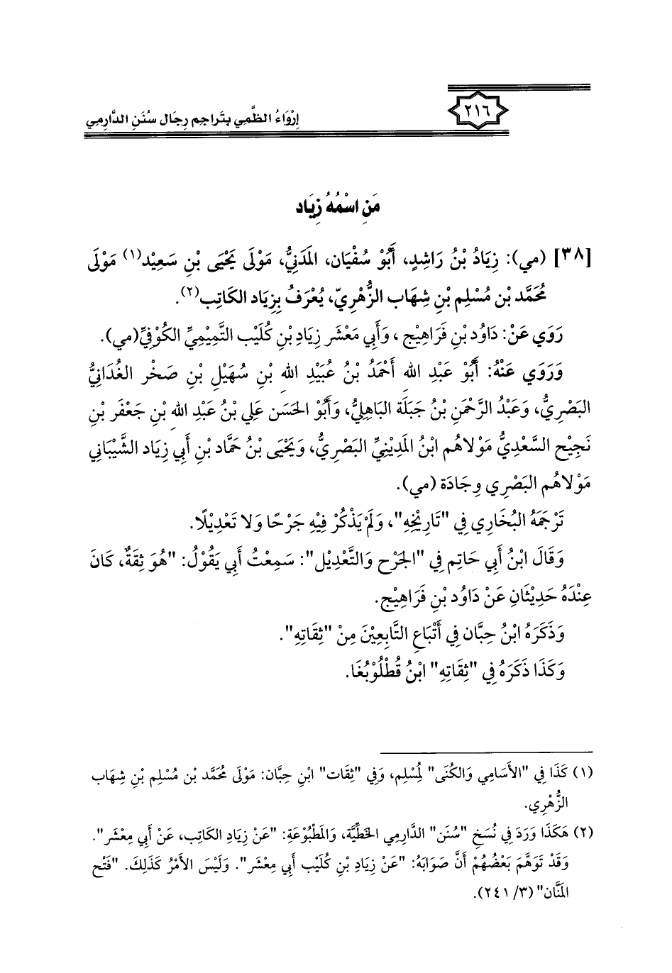 (¬٢) هَكَذَا وَرَدَ فِي نُسَخِ "سُنَن" الدَّارِمِي الخَطِّيَّة، وَالمَطْبُوْعَةِ: "عَنْ زِيَادِ الكَاتِب، عَنْ أَبِي مِعْشَر". وَقَدْ تَوَهَّمَ بَعْضُهُمْ أَنَّ صَوَابَهُ: "عَنْ زِيَادِ بْنِ كُلَيْب أَبِي مِعْشَر". وَلَيْسَ الأَمْرُ كَذَلِكَ. "فَتْح المَنَّان" (٣/ ٢٤١).