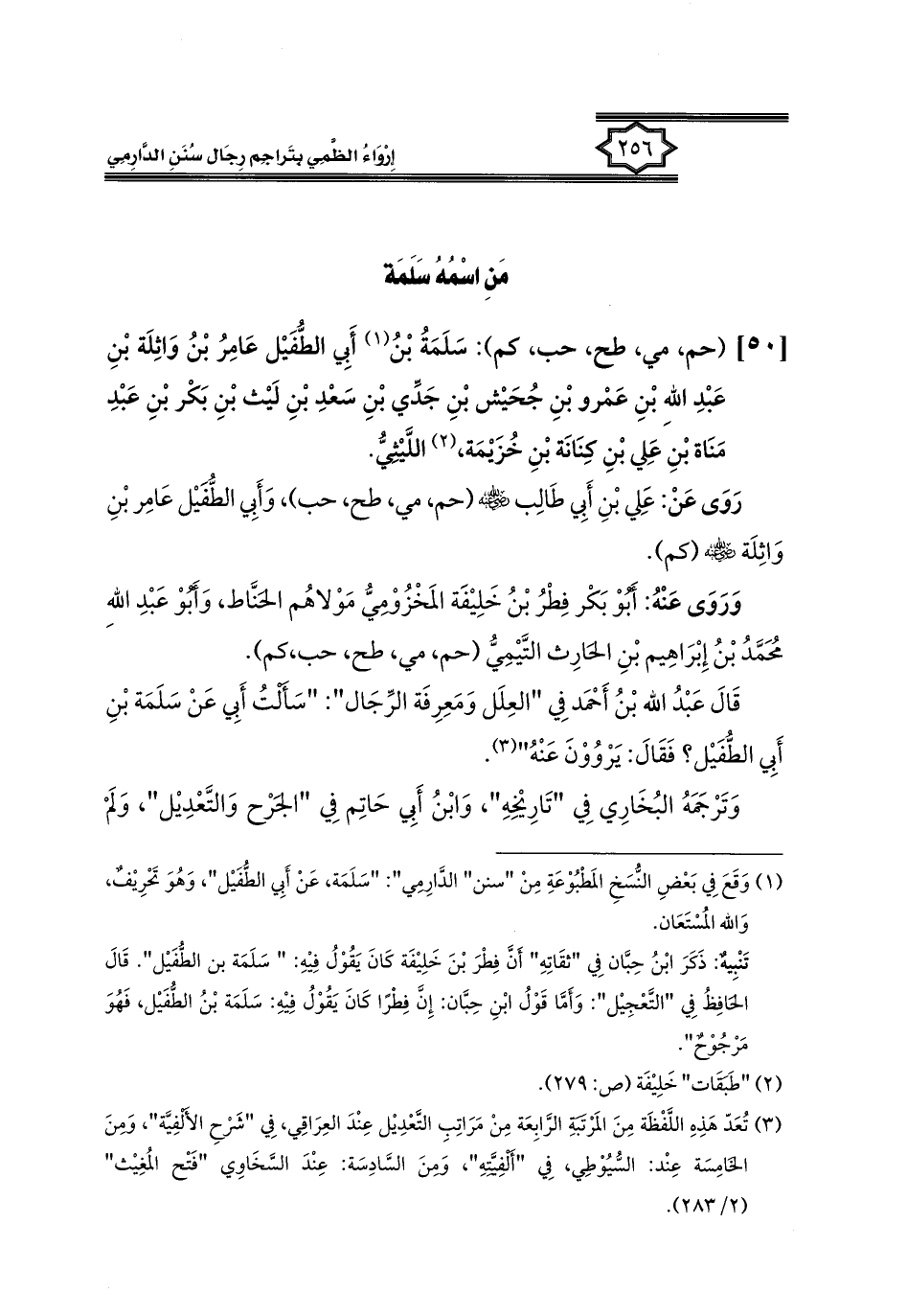 (¬١) وَقَعَ فِي بَعْضِ النُّسَخِ المَطْبُوْعَةِ مِنْ "سنن" الدَّارِمي": "سَلَمَة، عَنْ أَبِي الطُّفَيْل"، وَهُوَ تَحْرِيْفٌ، وَالله المُسْتَعَان.