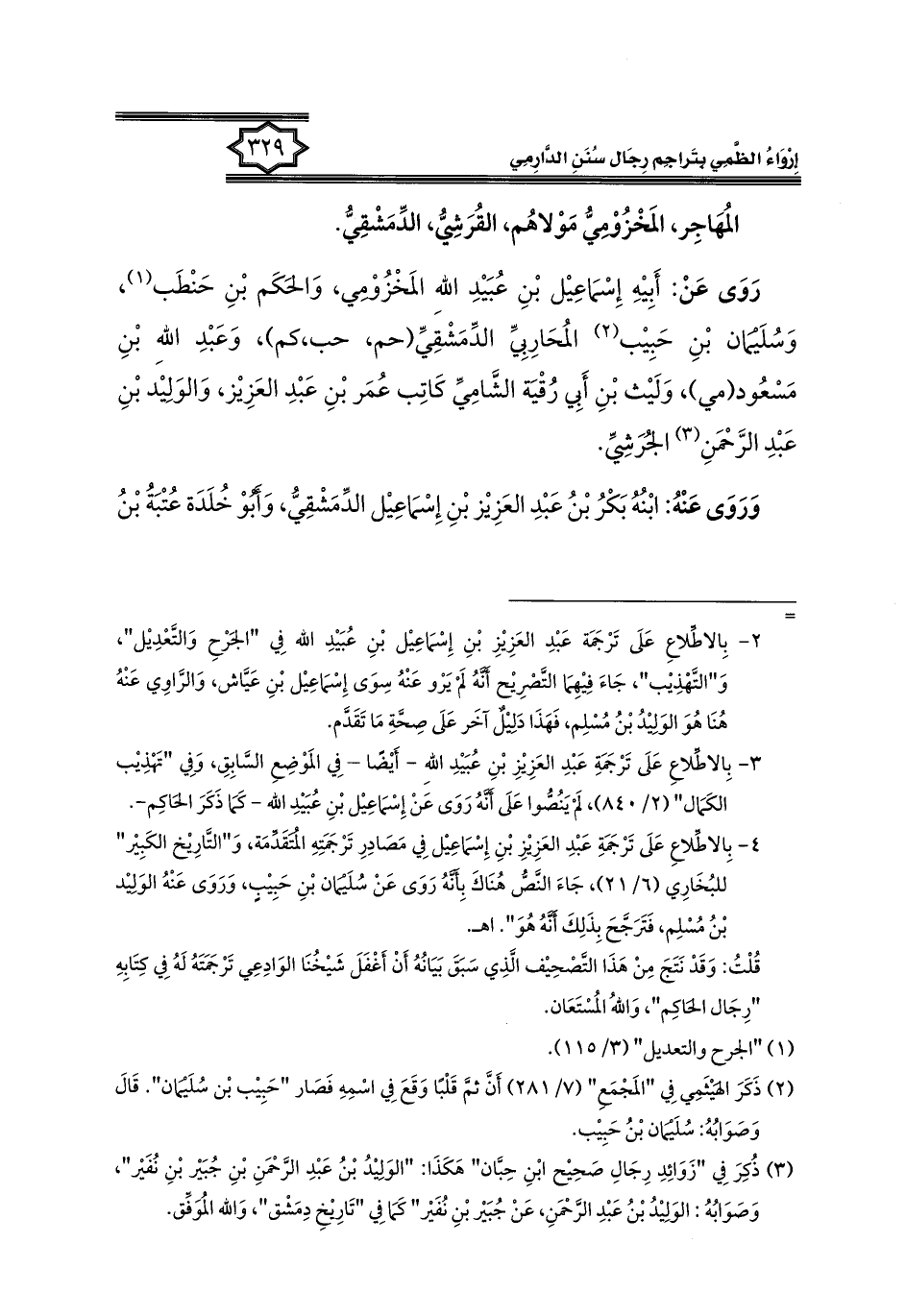 (¬٣) ذُكِرَ فِي "زَوَائِدِ رِجَالِ صَحِيْح ابْنِ حِبَّان" هَكَذَا: "الوَلِيْدُ بْنُ عَبْدِ الرَّحْمَنِ بْنِ جُبَيْر بْنِ نُفَيْر"، وَصَوَابُهُ: الوَلِيْدُ بْنُ عَبْدِ الرَّحْمَنِ، عَنْ جُبَيْر بْنِ نُفَيْر"كَمَا فِي "تَارِيْخِ دِمَشْق"، وَالله المُوَفِّق.