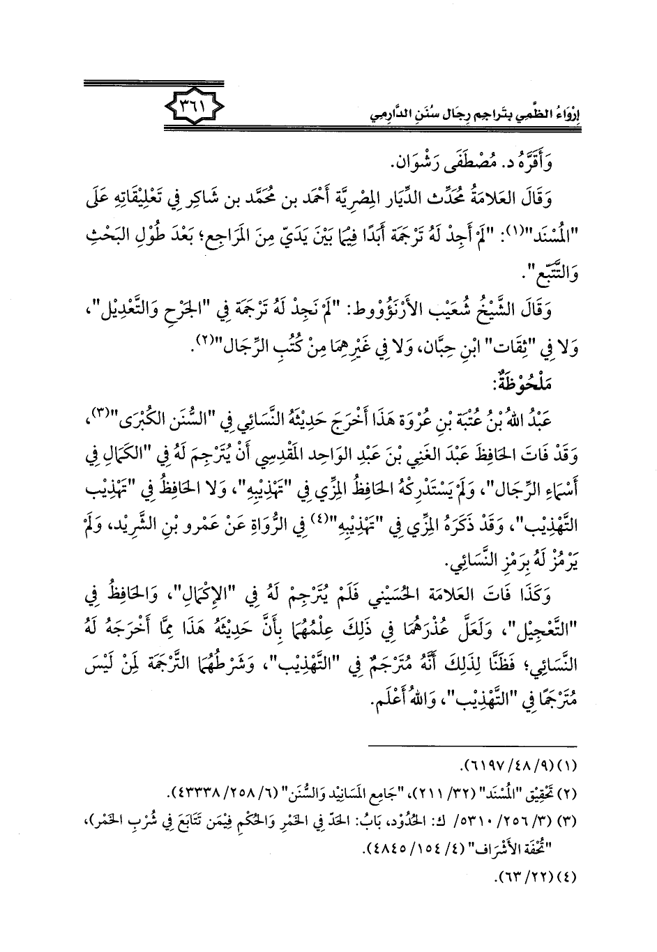 عَبْدُ اللهُ بْنُ عُتْبَة بْنِ عُرْوَة هَذَا أَخْرَجَ حَدِيْثَهُ النَّسَائِي فِي "السُّنَن الكُبْرَى" (¬٣)، وَقَدْ فَاتَ الحَافِظَ عَبْدَ الغَنِي بْنَ عَبْدِ الوَاحِد المَقْدِسِي أَنْ يُتَرْجِمَ لَهُ فِي "الكَمَالِ فِي أَسْمَاءِ الرِّجَال"، وَلَمْ يَسْتَدْرِكْهُ الحَافِظُ المِزِّي فِي "تَهْذِيْبِهِ"، وَلا الحَافِظُ فِي "تَهْذِيْب التَّهْذِيْب"، وَقَدْ ذَكَرَهُ المِزِّي فِي "تَهْذِيْبِهِ" (¬٤) فِي الرُّوَاةِ عَنْ عَمْرو بْنِ الشَّرِيْد، وَلَمْ يَرْمُزْ لَهُ بِرَمْزِ النَّسَائِي.