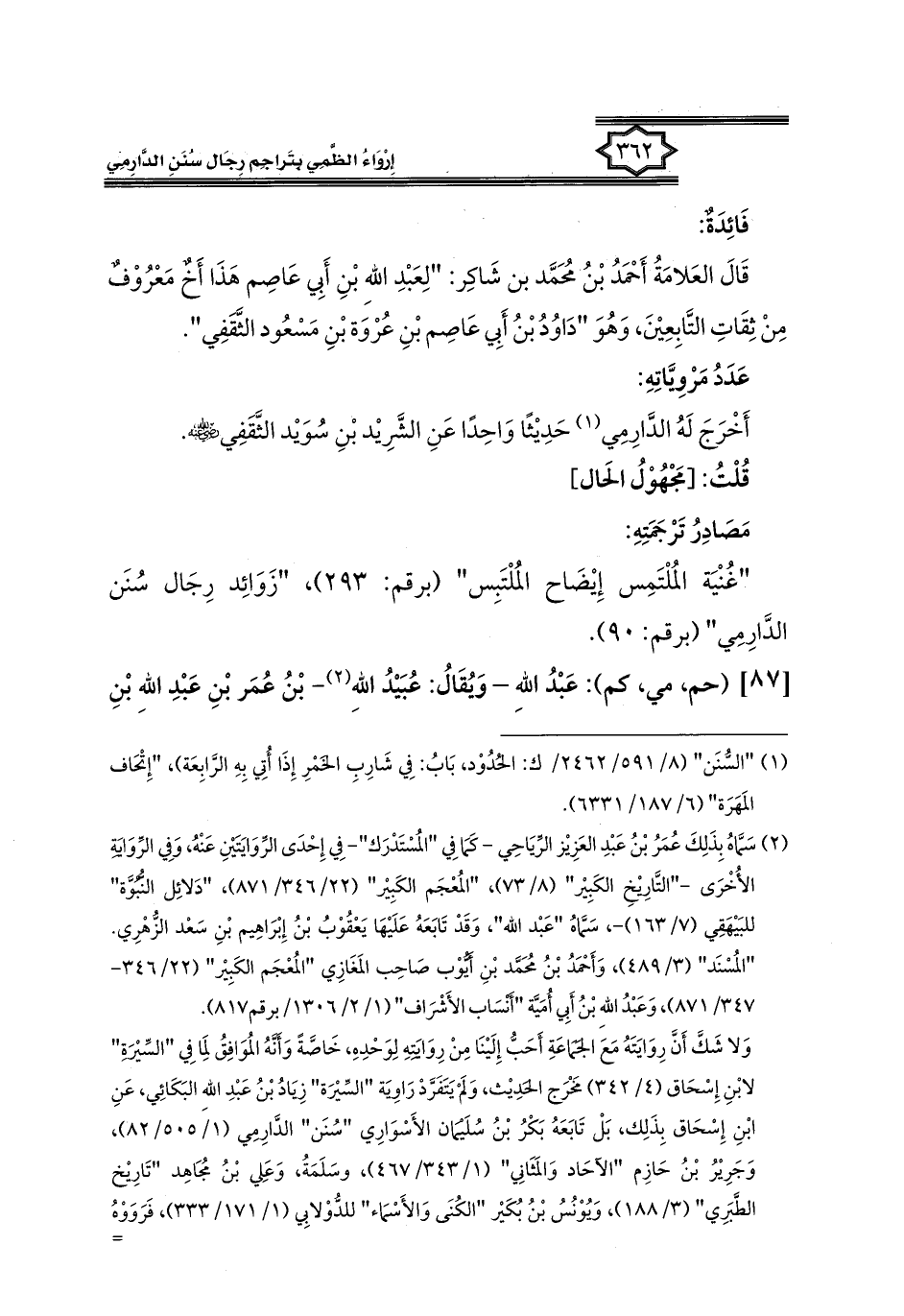 " غُنْيَة المُلْتَمِس إِيْضَاح المُلْتَبِس" (برقم: ٢٩٣)، "زَوَائِد رِجَال سُنَن الدَّارِمِي" (برقم: ٩٠).