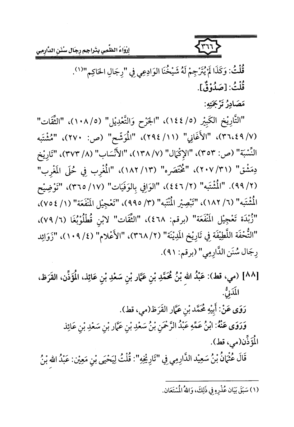 [٨٨] (مي، قط): عَبْدُ اللهِ بْنُ مُحَمَّدِ بْنِ عَمَّار بْنِ سَعْدِ بْنِ عَائِذ، المُؤَذِّن، القَرَظ، المَدَنِيُّ.