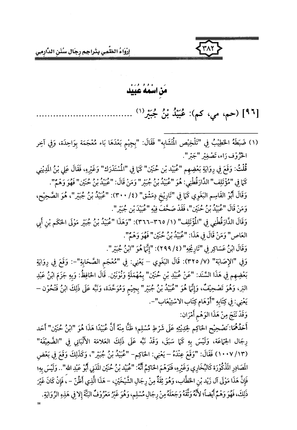 وَقَالَ الدَّارَقُطْنِي فِي "المُؤْتَلِف" (١/ ٣٦٥ - ٣٦٦): "وَهَذَا "عُبَيْدُ بْنُ جُبَيْر مَوْلَى الحَكَم بْنِ أَبِي العَاص" وَمَنْ قَالَ فِي هَذَا: "عُبَيْدُ بْنُ حُنَيْن" فَهُوَ وَهْمٌ".