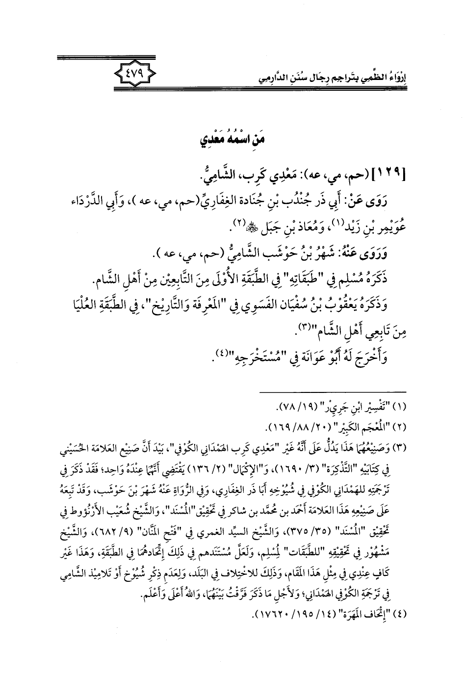 (¬٣) وَصَنِيْعُهُمَا هَذَا يَدُلُّ عَلَى أَنَّهُ غَيْر "مَعْدِي كَرِب الهَمْدَانِي الكُوْفي"، بَيْدَ أَنَّ صَنِيْع العَلامَة الحُسَيْني فِي كِتَابَيْهِ "التَّذْكِرَة" (٣/ ١٦٩٠)، وَ "الإِكْمَال" (٢/ ١٣٦) يَقْتَضِي أَنَّهُمَا عِنْدَهُ وَاحِد؛ فَقَدْ ذَكَرَ فِي تَرْجَمَتِهِ للهَمْدَانِي الكُوْفِي فِي شُيُوْخِهِ أَبَا ذَر الغِفَارِي، وَفِي الرُّوَاةِ عَنْهُ شَهْرَ بْنَ حَوْشَب، وَقَدْ تَبِعَهُ عَلَى صَنِيْعِهِ هَذَا العَلامَة أَحْمَد بن مُحمَّد بن شاكر فِي تَحْقِيْق "المُسْنَد"، وَالشَّيْخ شُعَيْب الأَرْنُؤوط فِي تَحْقِيْق "المُسْنَد" (٣٥/ ٣٧٥)، وَالشَّيْخ السيِّد الغمري فِي "فَتْحِ المَنَّان" (٩/ ٦٨٢)، وَالشَّيْخ مَشْهُوْر فِي تَحْقِيْقِهِ "للطَّبَقَات" لِمُسْلِم، وَلَعَلَّ مُسْتَنَدهم فِي ذَلِكَ إِتِّحَادهُمَا فِي الطَّبَقَةِ، وَهَذَا غَيْر كَافٍ عِنْدِي فِي مِثْلِ هَذَأ المَقَام، وَذَلِكَ للاخْتِلاف فِي البَلَد، وَلِعَدَمِ ذِكْرِ شُيُوْخ أَوْ تَلامِيْذ الشَّامِي فِي تَرْجَمَةِ الكُوْفِي الهَمْدَانِي؛ وَلأَجْلِ مَا ذَكَرَ فَرَّقْتُ بَيْنَهُمَا، وَاللهُ أَعْلَى وَأَعْلَم.