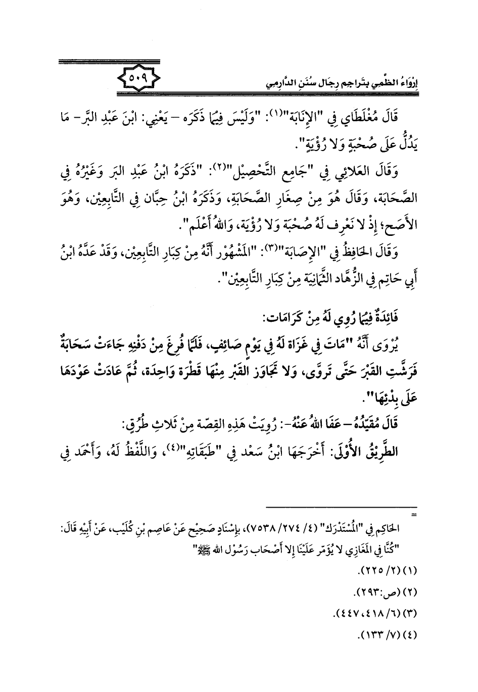 وَقَالَ العَلائِي فِي "جَامِع التَّحْصِيْل" (¬٢): "ذَكَرَهُ ابْنُ عَبْدِ البَر وَغَيْرُهُ فِي الصَّحَابَة، وَقَالَ هُوَ مِنْ صِغَارِ الصَّحَابَةِ، وَذَكَرَهُ ابْنُ حِبَّان فِي التَّابِعِيْن، وَهُوَ الأَصَح؛ إِذْ لا نَعْرِف لَهُ صُحْبَة وَلا رُؤْيَة، وَاللهُ أَعْلَم".