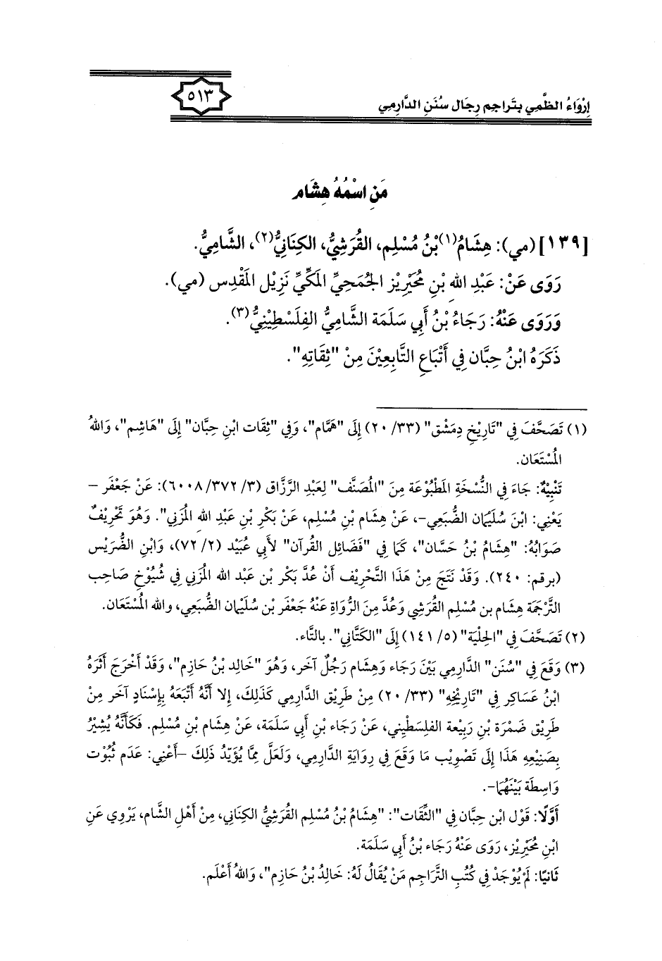 (¬٣) وَقَعَ فِي "سُنَن" الدَّارِمِي بَيْنَ رَجَاء وَهِشَام رَجُلٌ آخَر، وَهُوَ "خَالِد بْنُ حَازِم"، وَقَدْ أَخْرَجَ أثَرَهُ ابْنُ عَسَاكِر فِي "تَارِيْخِهِ" (٣٣/ ٢٠) مِنْ طَرِيْق الدَّارِمِي كَذَلِكَ، إِلا أَنَّهُ أَتْبَعَهُ بِإِسْنَادٍ آخَر مِنْ طَرِيْق ضَمْرَة بْنِ رَبِيْعة الفلِسَطْيِني، عَنْ رَجَاء بْنِ أَبِي سَلَمَة، عَنْ هِشَام بْنِ مُسْلِم. فَكَأَنَّهُ يُشِيْرُ بِصَنِيْعِهِ هَذَا إِلَى تَصْوِيْب مَا وَقَعَ فِي رِوَايَةِ الدَّارِمِي، وَلَعَلَّ مِمَّا يُؤَيّدُ ذَلِكَ -أَعْنِي: عَدَم ثُبُوْت وَاسِطَة بَيْنَهُمَا-.