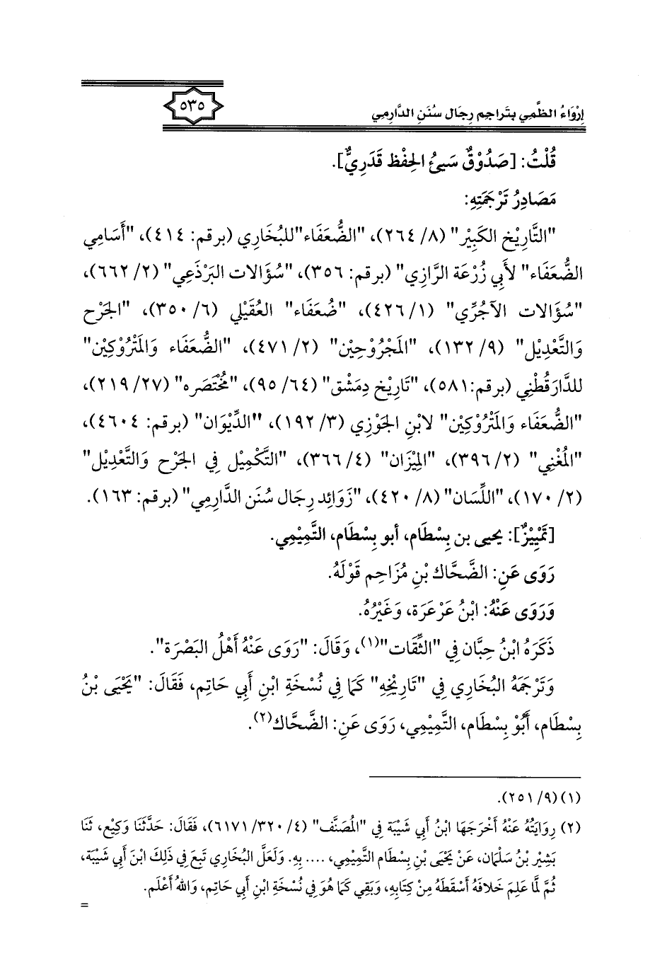 وَتَرْجَمَهُ البُخَارِي فِي "تَارِيْخِهِ" كَمَا فِي نُسْخَةِ ابْنِ أَبِي حَاتِم، فَقَالَ: "يَحْيَى بْنُ بِسْطَام، أَبُوْ بِسْطَام، التَّمِيْمِي، رَوَى عَنِ: الضَّحَّاك (¬٢).