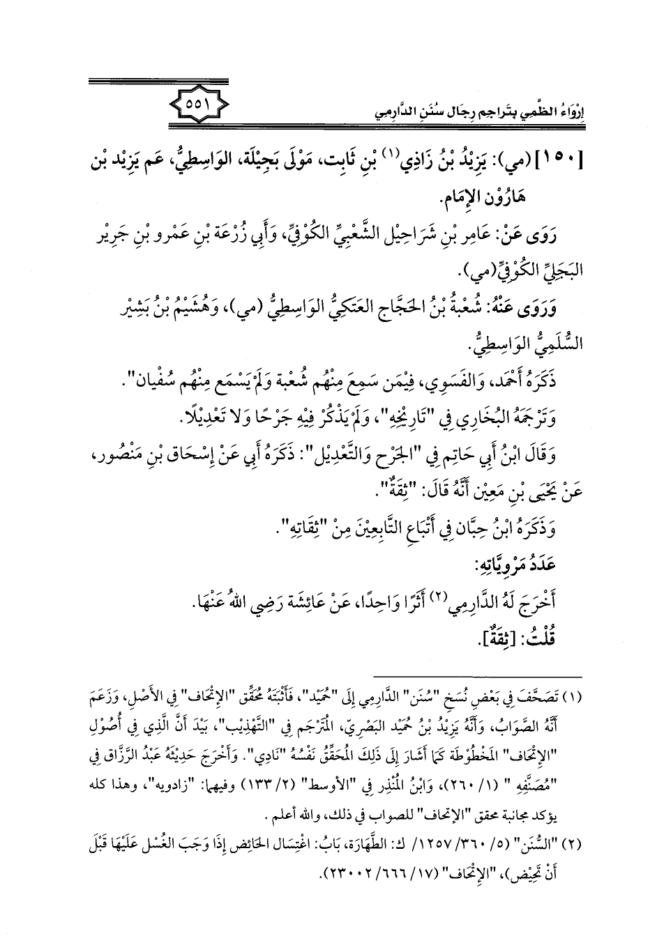 (¬١) تَصَحَّفَ فِي بَعْضِ نُسَخِ "سُنَن" الدَّارِمِي إِلَى "حُمَيْد"، فَأَثْبَتَهُ مُحَقِّق "الإِتْحَاف" فِي الأَصْلِ، وَزَعَمَ أَنَّهُ الصَّوَابُ، وَأَنَّهُ يَزِيْدُ بْنُ حُمَيْد البَصْرِيّ، المُتَرْجَم فِي "التَّهْذِيْب"، بَيْدَ أَنَّ الَّذِي فِي أُصُوْلِ "الإِتْحَاف" المَخْطُوْطَة كَمَا أَشَارَ إِلَى ذَلِكَ المُحَقَقُ نَفْسُهُ "نَادِي". وَأَخْرَجَ حَدِيْثَهُ عَبْدُ الرَّزَّاق فِي "مُصَنَّفِهِ" (١/ ٢٦٠)، وَابْنُ المُنْذِر فِي "الأوسط" (٢/ ١٣٣) وفيهما: "زادويه"، وهذا كله يؤكد مجانبة محقق "الإتحاف" للصواب في ذلك، والله أعلم.