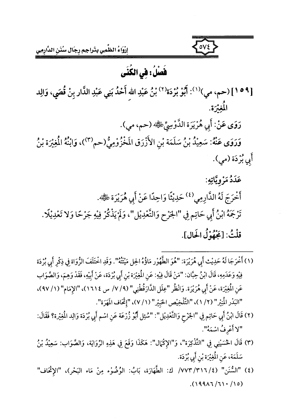 (¬٢) قَالَ ابْنُ أَبِي حَاتِم فِي "الجَرْحِ وَالتَّعْدِيْل": "سُئِل أَبُو زُرْعَة عَنِ اسْم أَبِي بُرْدَة وَالِد المُغِيْرة؟ فَقَالَ: "لا أَعْرِفُ اسْمَهُ".