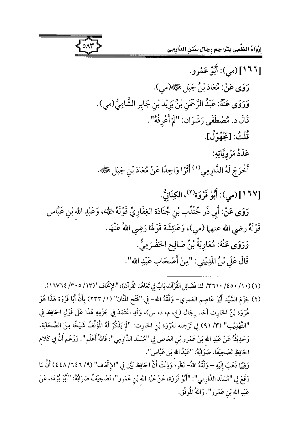 (¬٢) جَزَمَ السَّيِّد أَبُوْ عَاصِم الغمري -وَفَّقَهُ الله- فِي "فَتْح المَنَّان" (١/ ٢٣٣) بِأَنَّ أَبَا فَرْوَة هَذَا هُوَ عُرْوَة بْنُ الحَارِث أَحَد رِجَال (خ، م، د، س)، وَقَدِ اعْتَمَدَ فِي جَزْمِهِ هَذَا عَلَى قَوْلِ الحَافِظ فِي "التَّهْذِيْب" (٣/ ٩١) فِي تَرْجمته لعُرْوَة بْنِ الحَارِث: "لَمْ يَذْكُرْ لَهُ المُؤَلِّفُ شَيْخًا مِنَ الصَّحَابَة، وَحَدِيْثُهُ عَنْ عَبْدِ الله بَنْ عَمْرو بْنِ العَاص فِي "مُسْنَد الدَّارِمِي"، فَالله أَعْلَم". وَزَعَم أَنَّ فِي كَلامِ الحَافِظِ تَصْحِيْفًا، صَوَابُهُ: "عَبْدُ الله بْن عَبَّاس".
