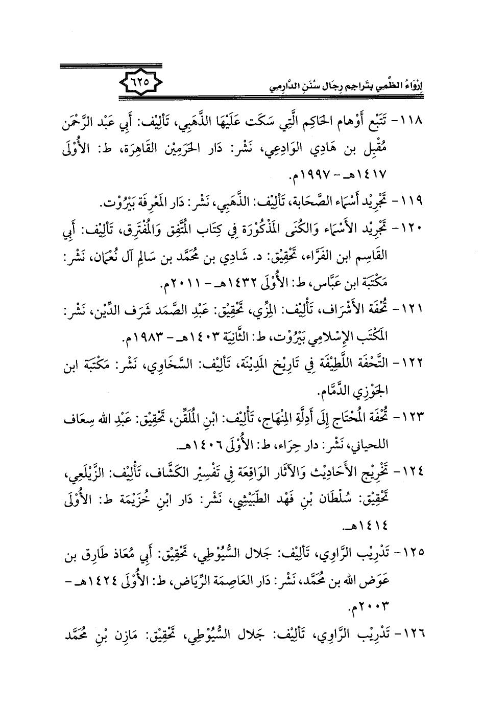 ١٢٥ - تَدْرِيْب الرَّاوِي، تَأْلِيْف: جَلال السُّيُوْطِي، تَحْقِيْق: أَبِي مُعَاذ طَارِق بن عَوَض الله بن مُحَمَّد، نَشْر: دَار العَاصِمَة الرِّيَاض، ط: الأُوْلَى ١٤٢٤ هـ - ٢٠٠٣ م.