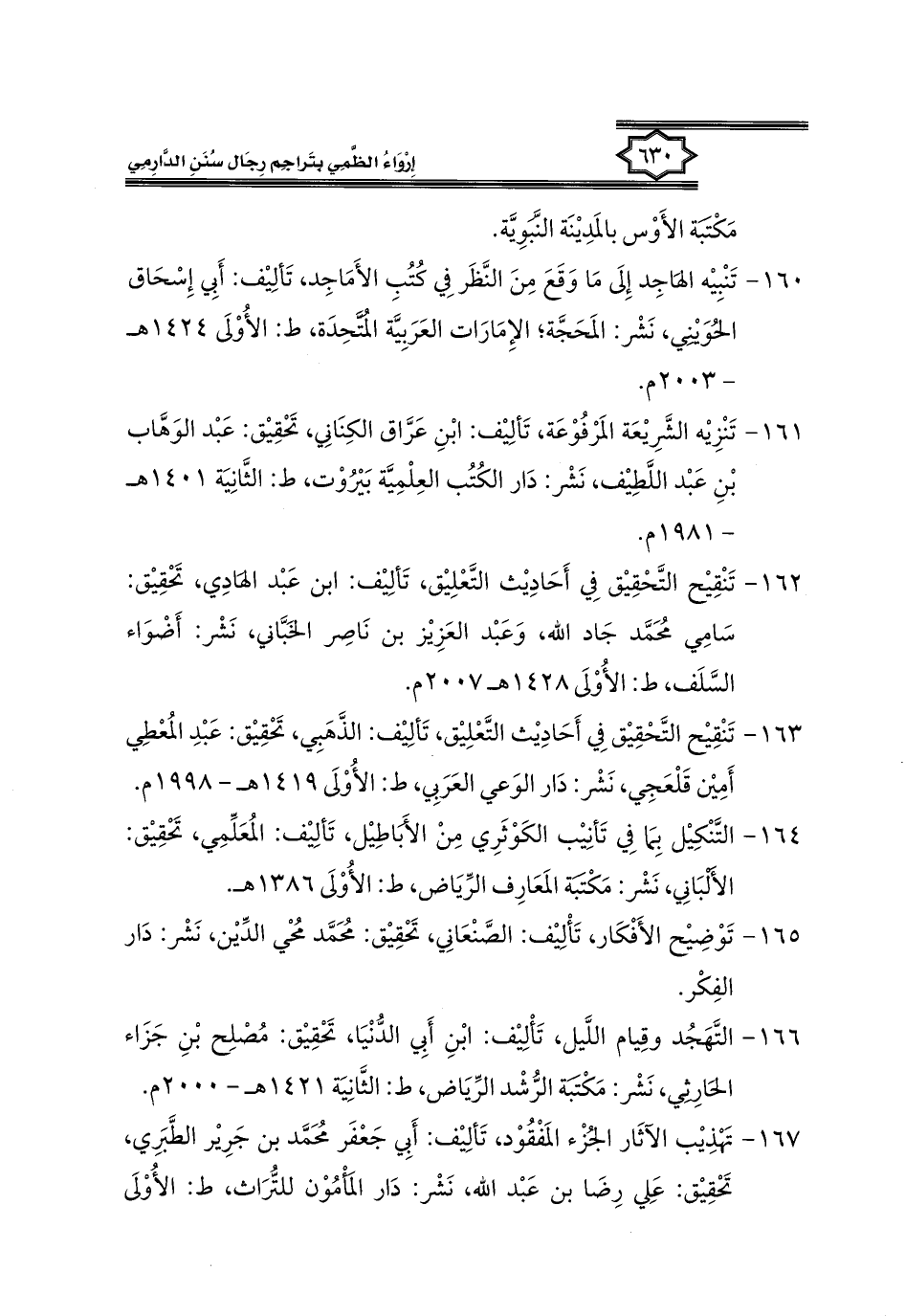 ١٦٤ - التَّنْكِيْل بِمَا فِي تَأنِيْب الكَوْثَرِي مِنْ الأَبَاطِيْل، تَألِيْف: المُعَلِّمِي، تَحْقِيْق: الأَلْبَانِي، نَشْر: مَكْتَبَة المَعَارِف الرِّيَاض، ط: الأُوْلَى ١٣٨٦ هـ.