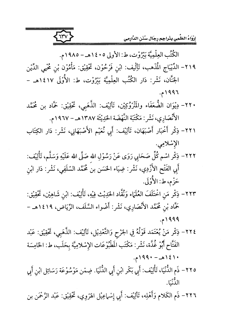 ٢٢٠ - دِيْوَان الضُّعَفَاء والمَتْرْوُكِيْن، تَألِيْف: الذَّهَبِي، تَحْقِيْق: حَمَّاد بن مُحَمَّد الأَنْصَارِي، نَشْر: مَكْتَبَة النَّهْضَة الحَدِيْثَة ١٣٨٧ هـ -١٩٦٧ م.