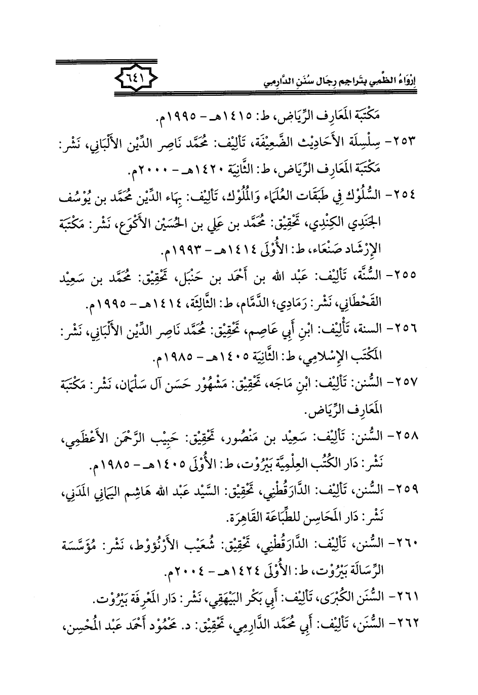٢٦٠ - السُّنن، تَأْلِيْف: الدَّارَقُطْنِي، تَحْقِيْق: شُعَيْب الأَرْنُؤوْط، نَشْر: مُؤَسَّسَة الرِّسَالَة بَيْرُوْت، ط: الأُوْلَى ١٤٢٤ هـ - ٢٠٠٤ م.