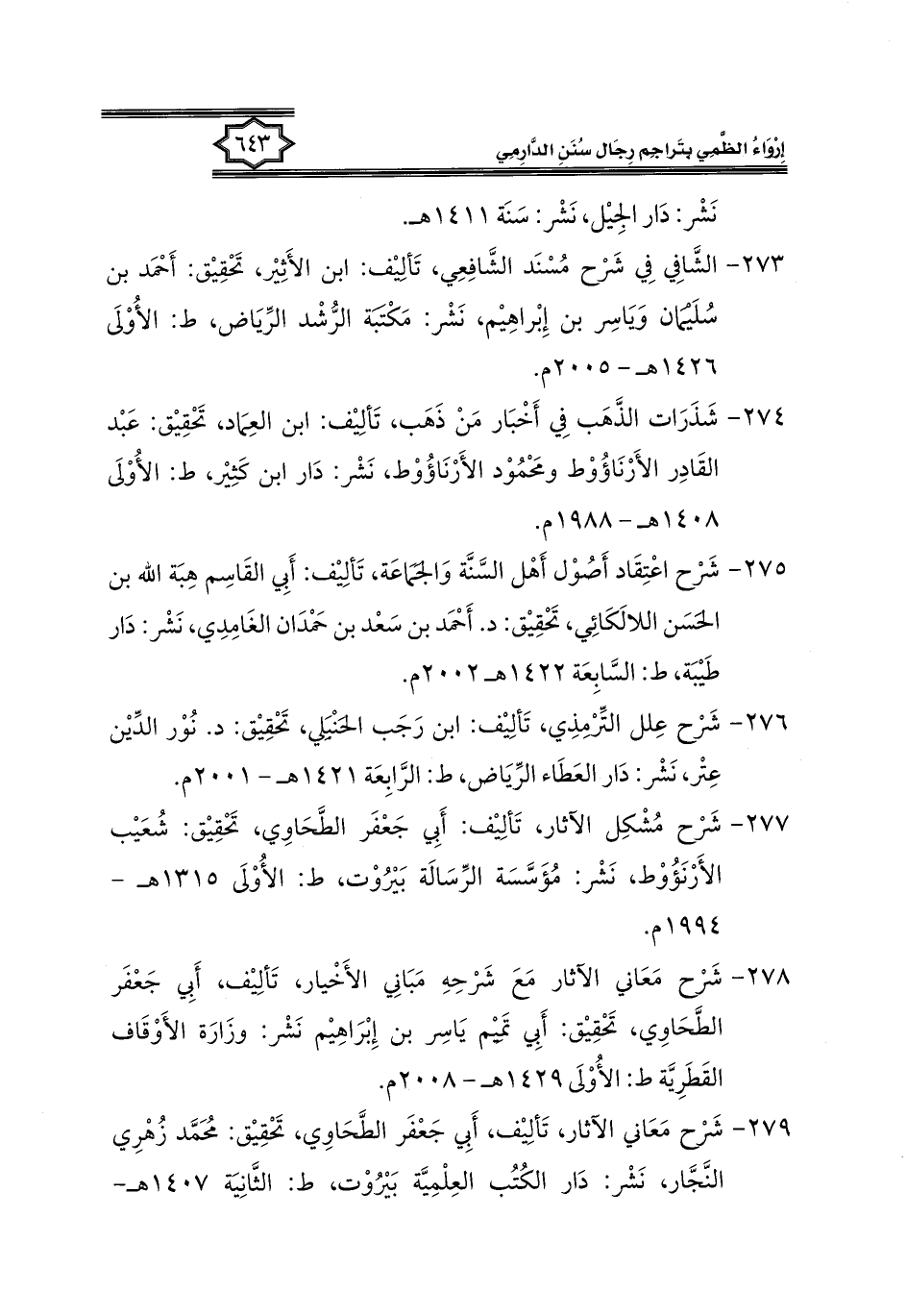 ٢٧٧ - شَرْح مُشْكِل الآثار، تَألِيْف: أَبِي جَعْفَر الطَّحَاوِي، تَحْقِيْق: شُعَيْب الأَرْنَؤُوْط، نَشْر: مُؤَسَّسَة الرِّسَالَة بَيْرُوْت، ط: الأُوْلَى ١٣١٥ هـ - ١٩٩٤ م.
