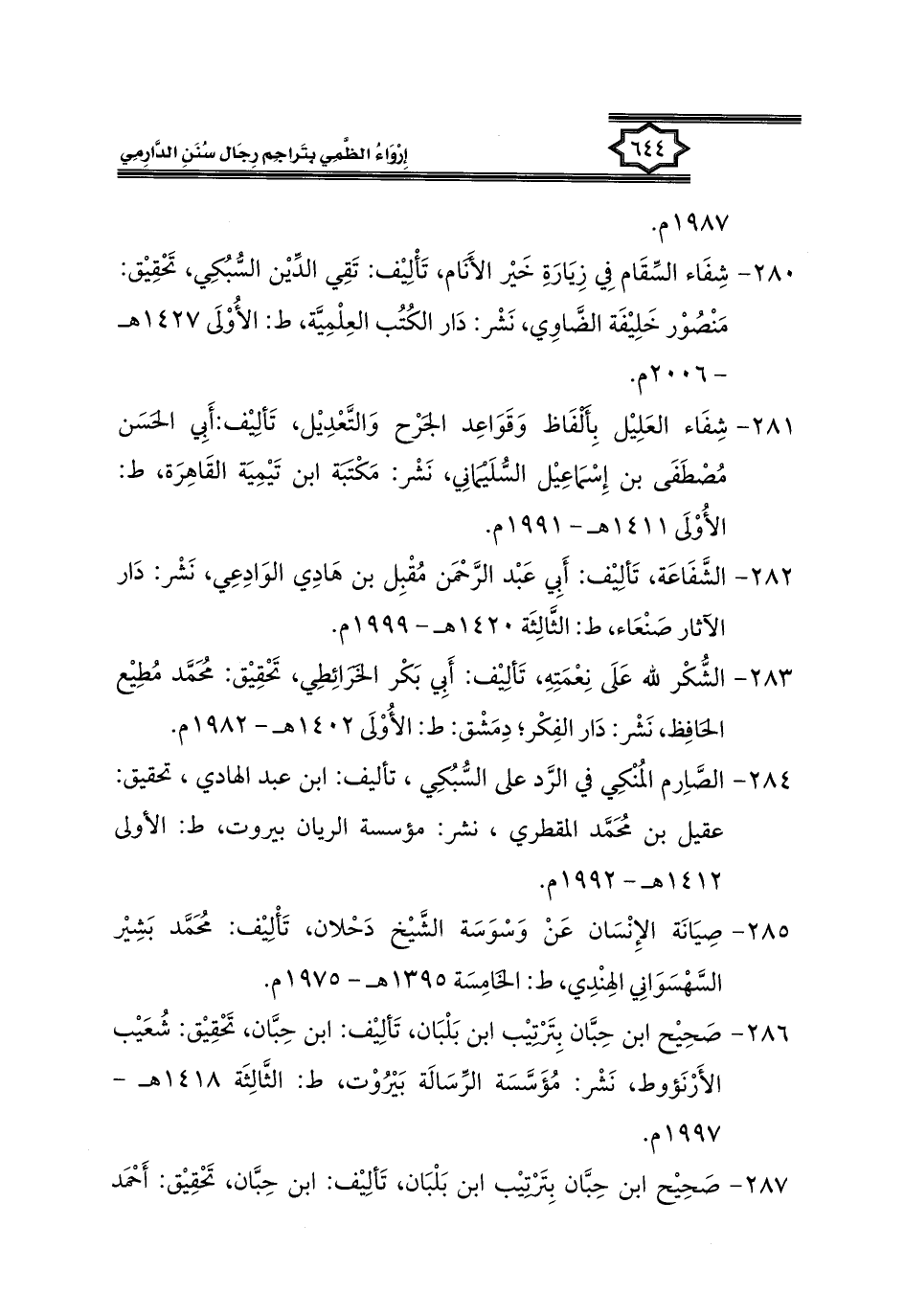 ٢٨١ - شِفَاء العَلِيْل بِأَلْفَاظ وَقَوَاعِد الجَرْح وَالتَّعْدِيْل، تَألِيْف: أَبِي الحَسَن مُصْطَفَى بن إِسْمَاعِيْل السُّلَيْمَانِي، نَشْر: مَكْتَبَة ابن تَيْمِيَة القَاهِرَة، ط: الأُوْلَى ١٤١١ هـ -١٩٩١ م.