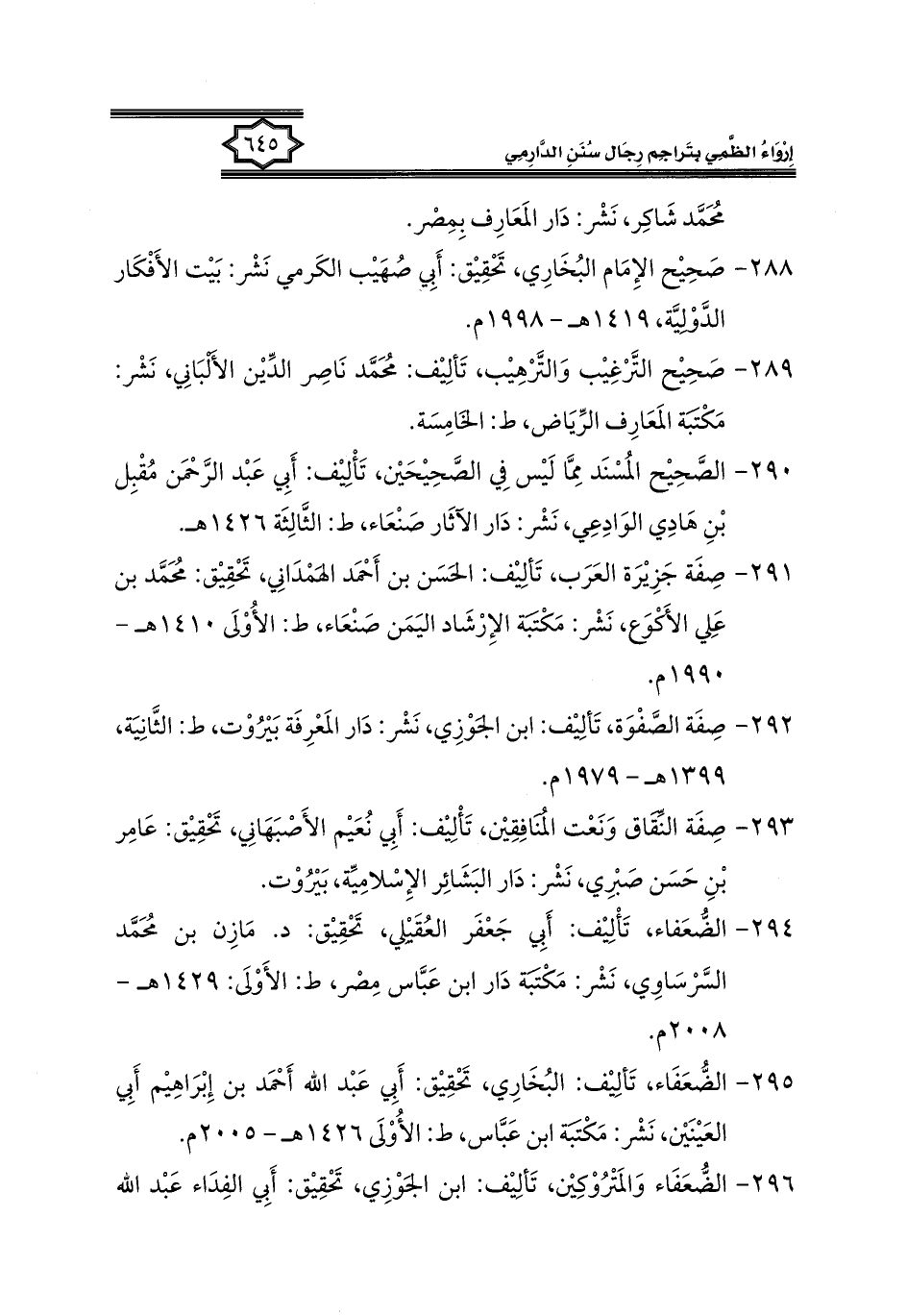 ٢٩٥ - الضُّعَفَاء، تَألِيْف: البُخَارِي، تَحْقِيْق: أَبِي عَبْد الله أَحْمَد بن إِبْرَاهِيْم أَبِي العَيْنَيْن، نَشْر: مَكْتَبَة ابن عَبَّاس، ط: الأُوْلَى ١٤٢٦ هـ - ٢٠٠٥ م.